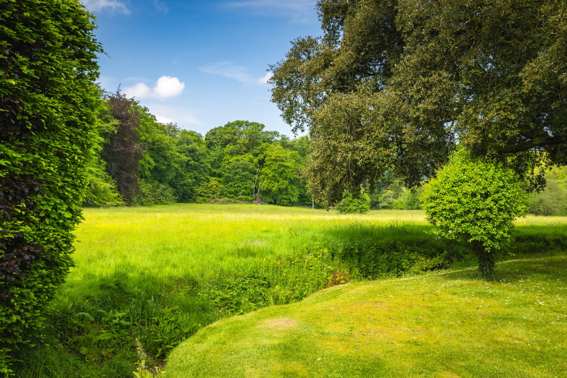Surrounding the property are the more formal gardens which contain numerous mature trees, shrubs, and flower beds. Directly in front of the mansion is a large level lawn which is encircled by a ha-ha which forms part of the ingenious drainage that prevents the buildings from being at any risk of flooding. The formal gardens roll gently downhill to the rest of the land which comprises of beautiful water meadows that go down to meet the stream. To all sides of the mansion are patios, terraces, and seating areas that can follow the sun, or provide shade from it, throughout the day. To the rear is an herb garden and large chicken enclosure. These seating options include a clever rotating summer house in the rear gardens which looks out over the meadows beyond it.