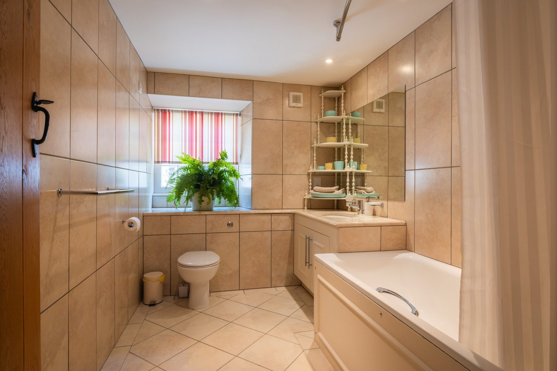 Providing a cloakroom and shower for the ground floor, which is easily accessible from the garden, this space is a handy addition to this level of the property. The space offers a hand basin, lavatory, and shower cubicle and is finished with tiled floor, walls, and a rooflight above that brings in natural light.