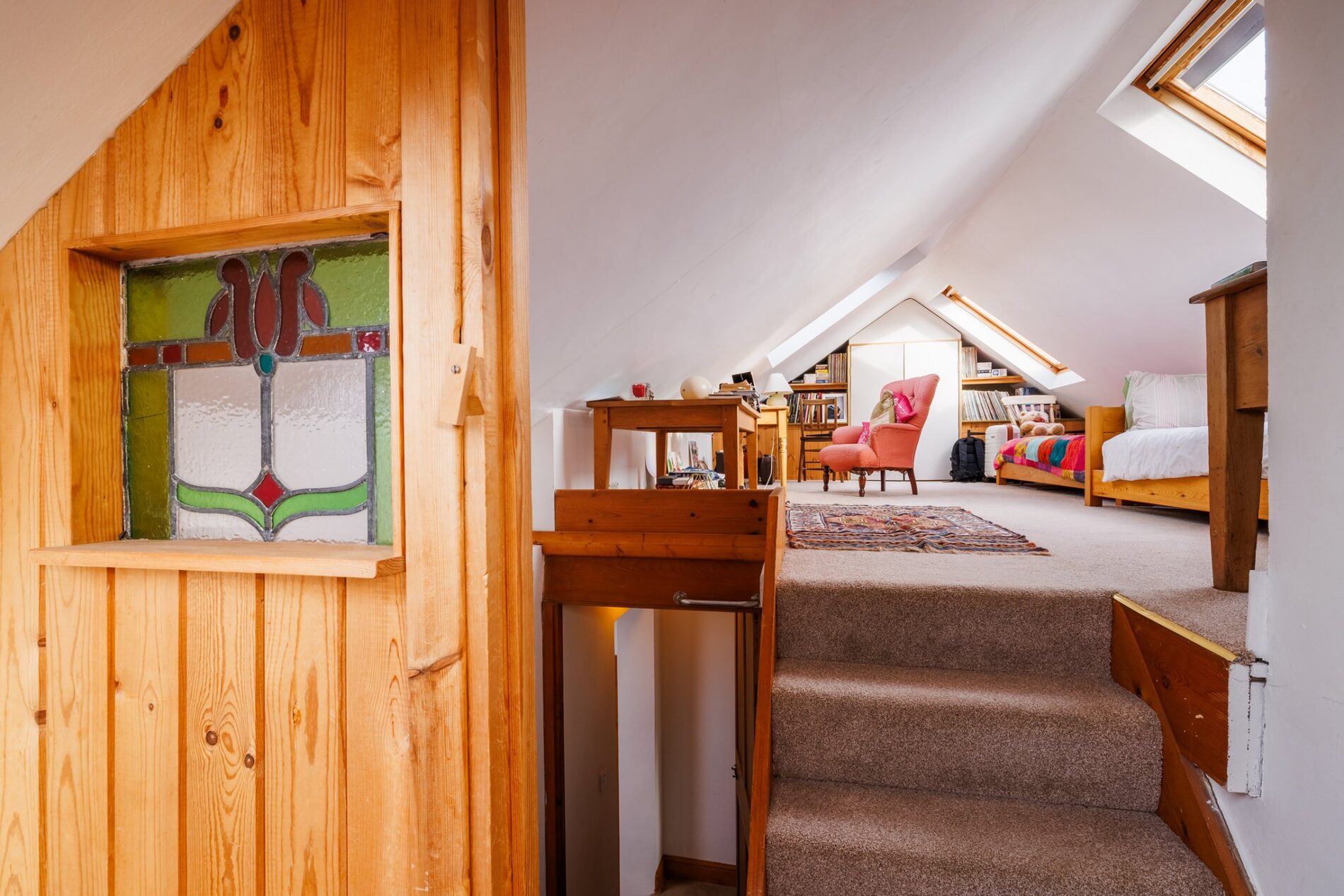 The staircase continues up to this flexible space, which is currently used as a study. The space has restricted head height in places but still offers a versatile area with numerous potential uses, along with rooflights to the front and rear.