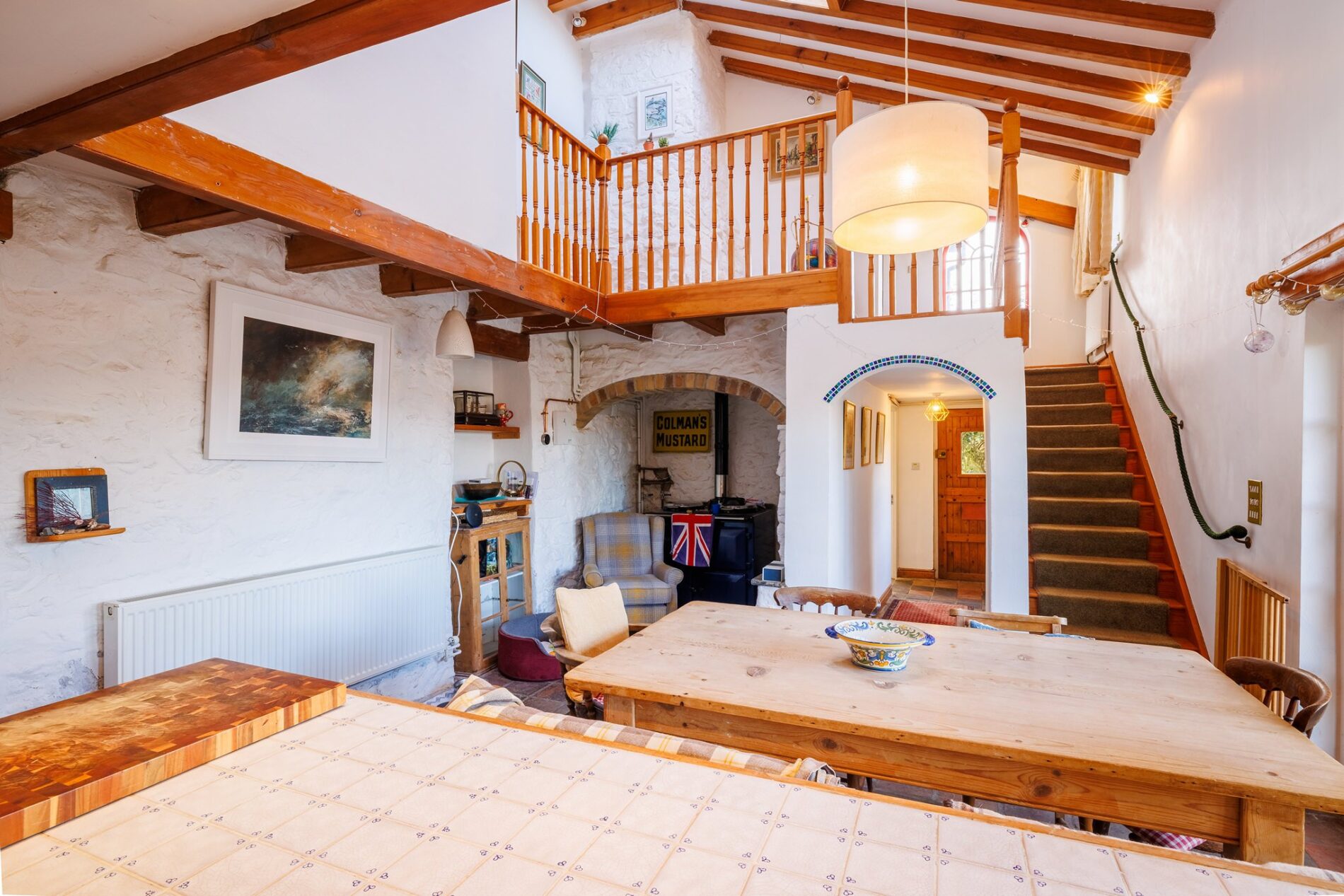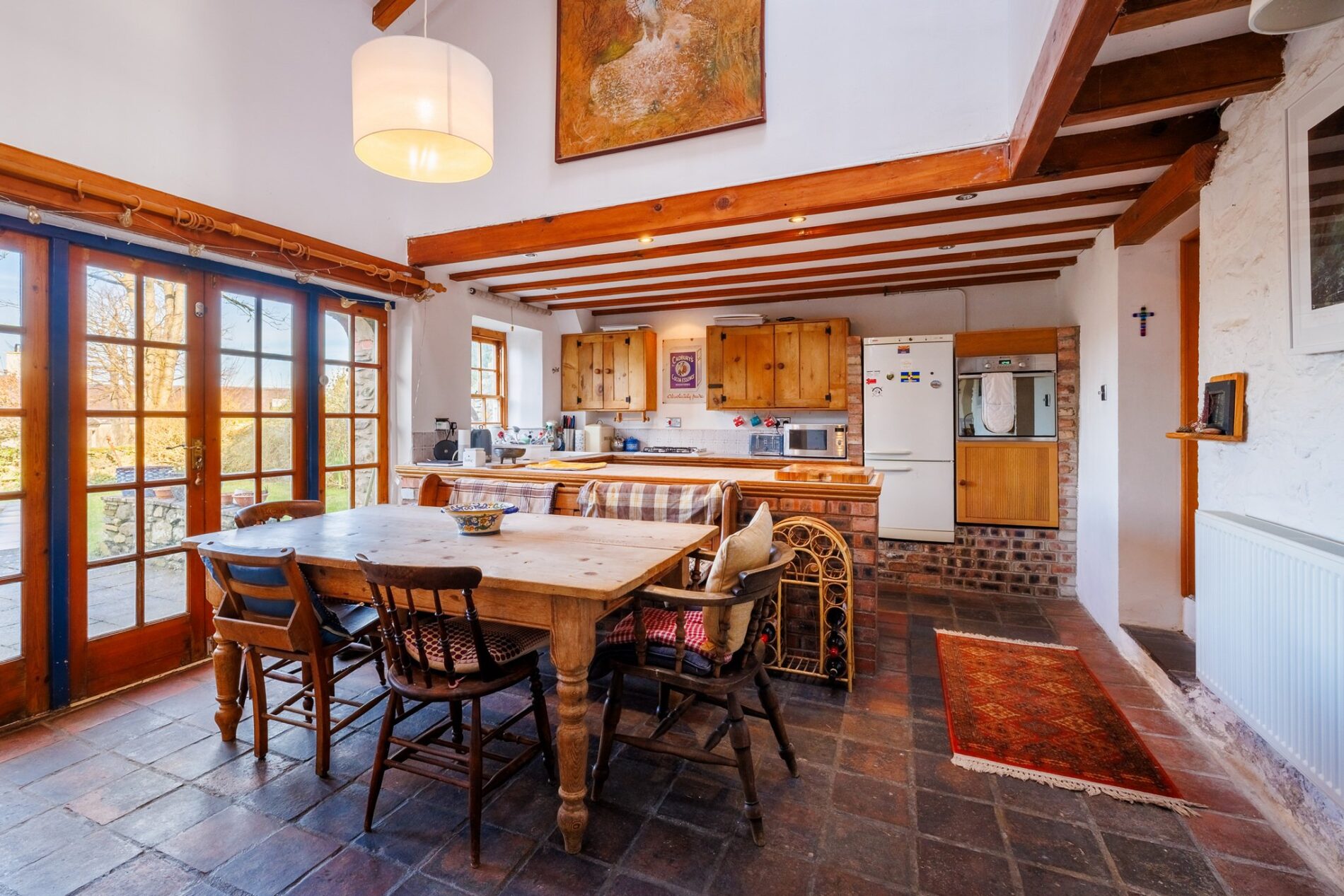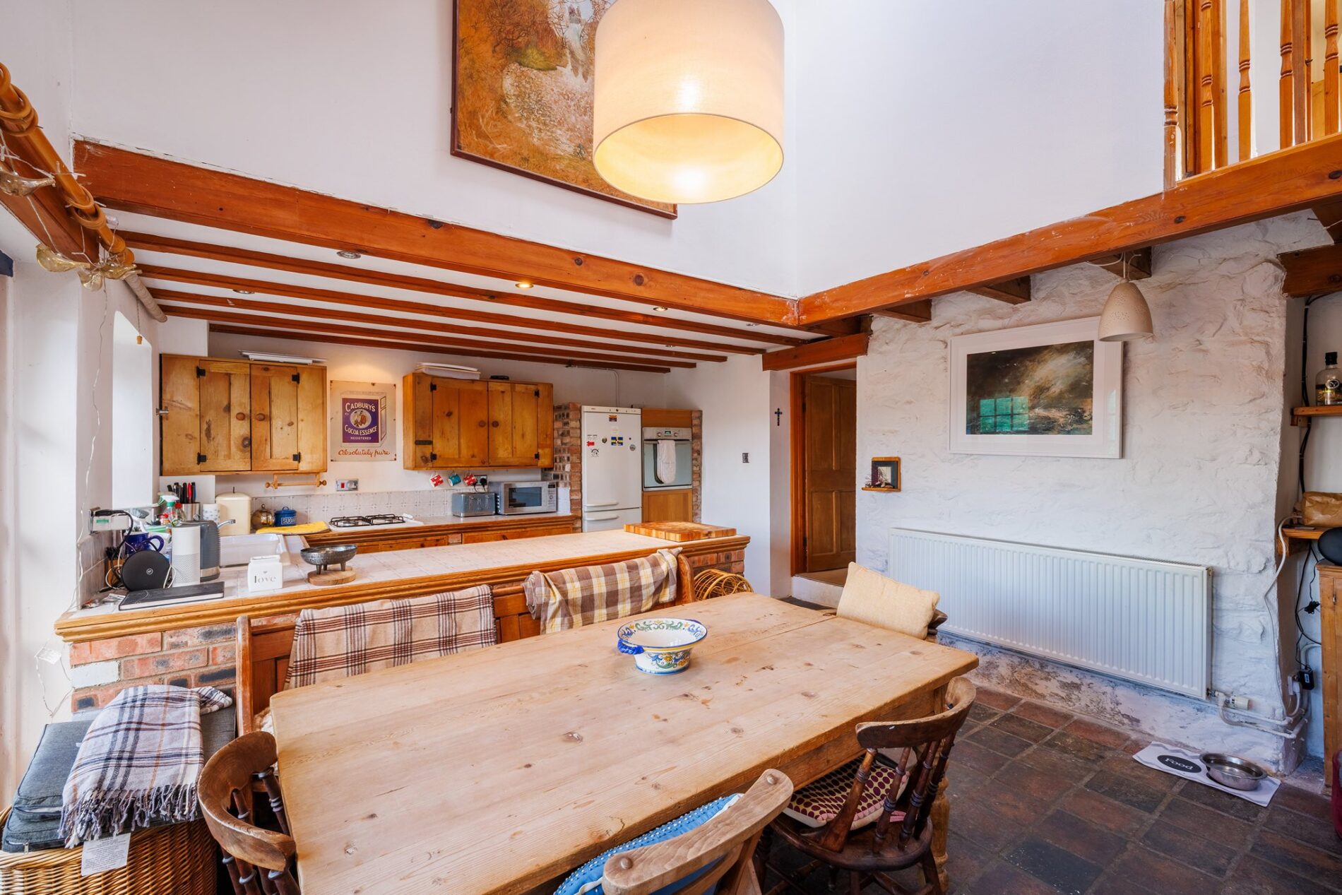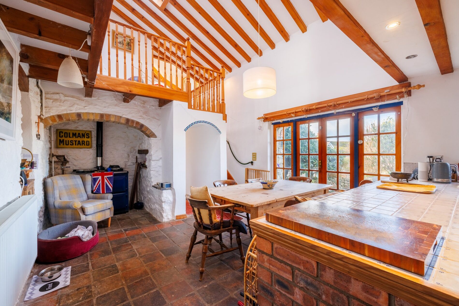 This charming space is undoubtedly the heart of the home. The ceiling is double height, extending up to the galleried landing above, with exposed beams as another feature. There are French windows out to the garden, with another sash window by the kitchen area. At the centre of the space is room for a large dining table, with the kitchen found along the rear wall.