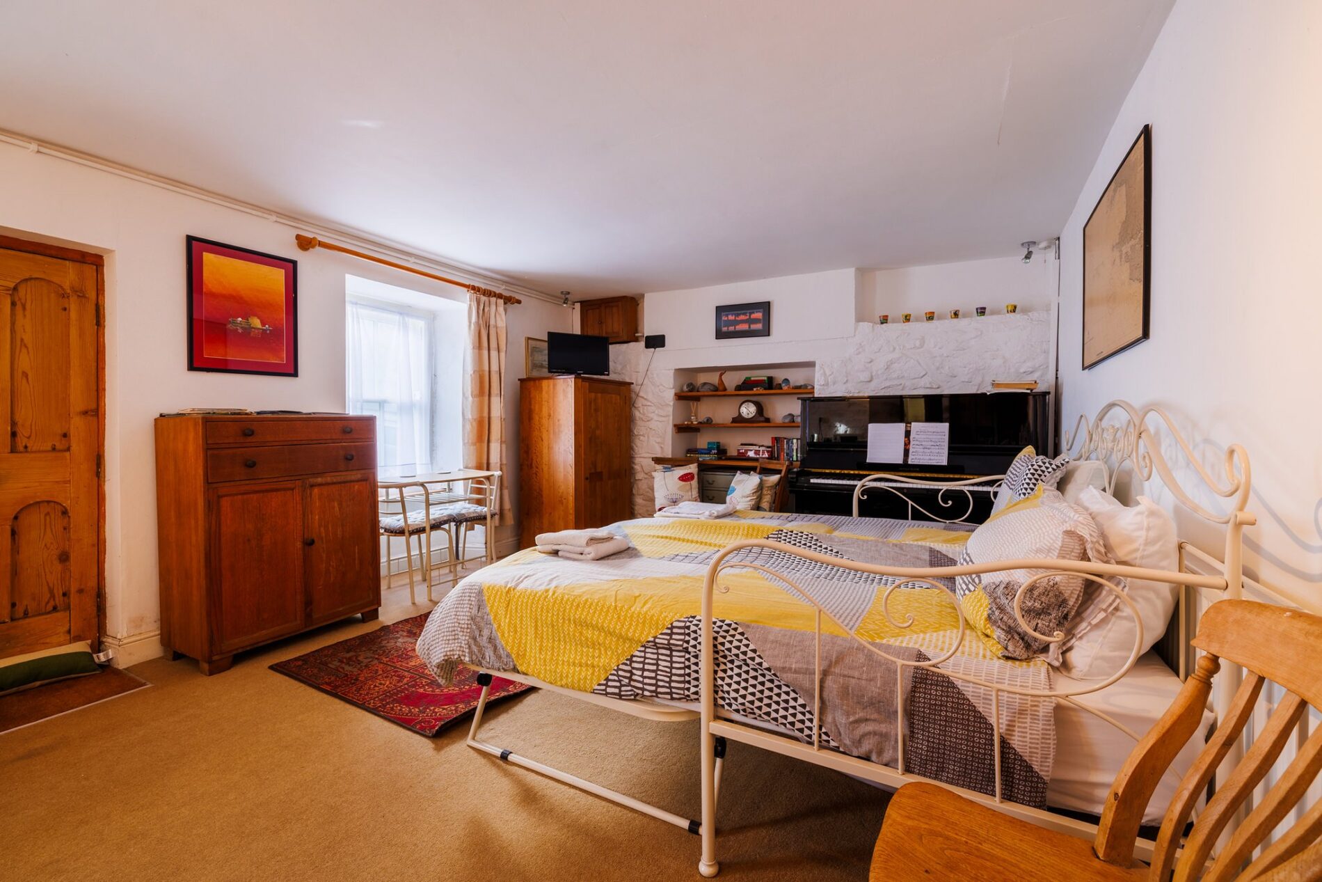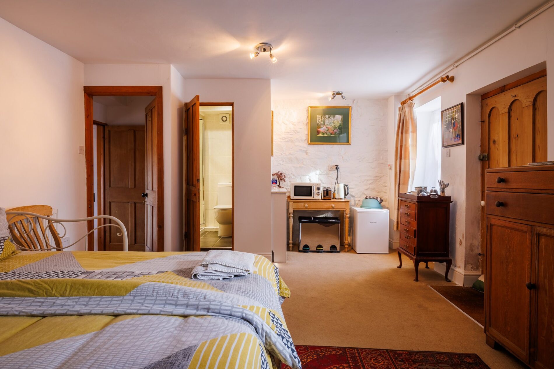 This space is found to the front of the home and can be accessed from the outside and via a set of two lockable doors from the kitchen. Previously used as a self-contained letting unit, this space currently serves as overflow accommodation for the owner’s guests. The room offers enough space for a seating area and double bed, along with a small kitchenette. This is believed to be the oldest part of the property and has lovely stonework around the original hearth. To the side of the space, there is a door to the ensuite shower room.
