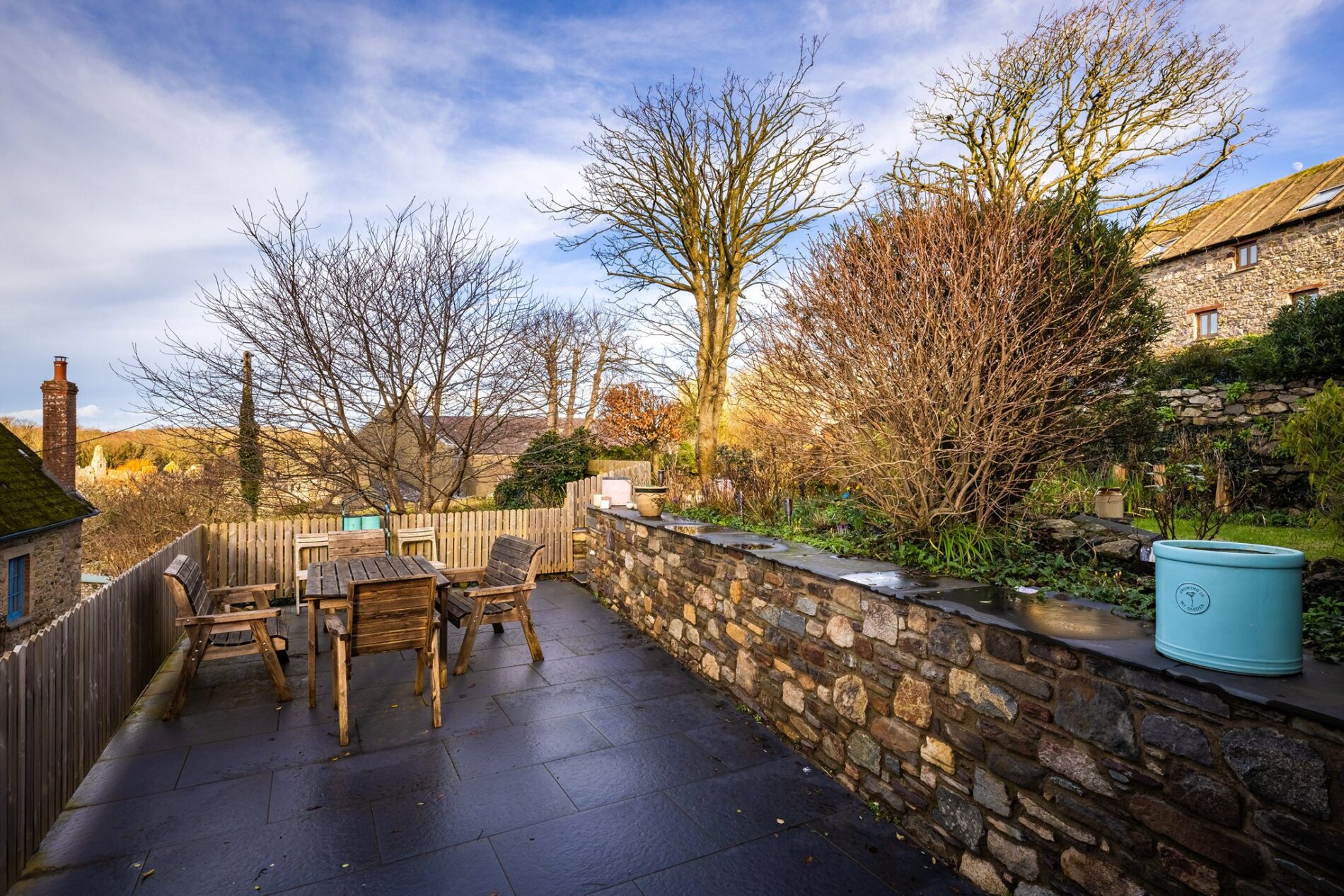 The rear garden is a charming space with a patio area immediately outside the doors from the dining room. This patio leads to a path which runs to the rear of the garden, with a lawned area to the right. The path leads to a beautiful, raised patio seating area which enjoys sun throughout the day and makes for a wonderful space to unwind or entertain.