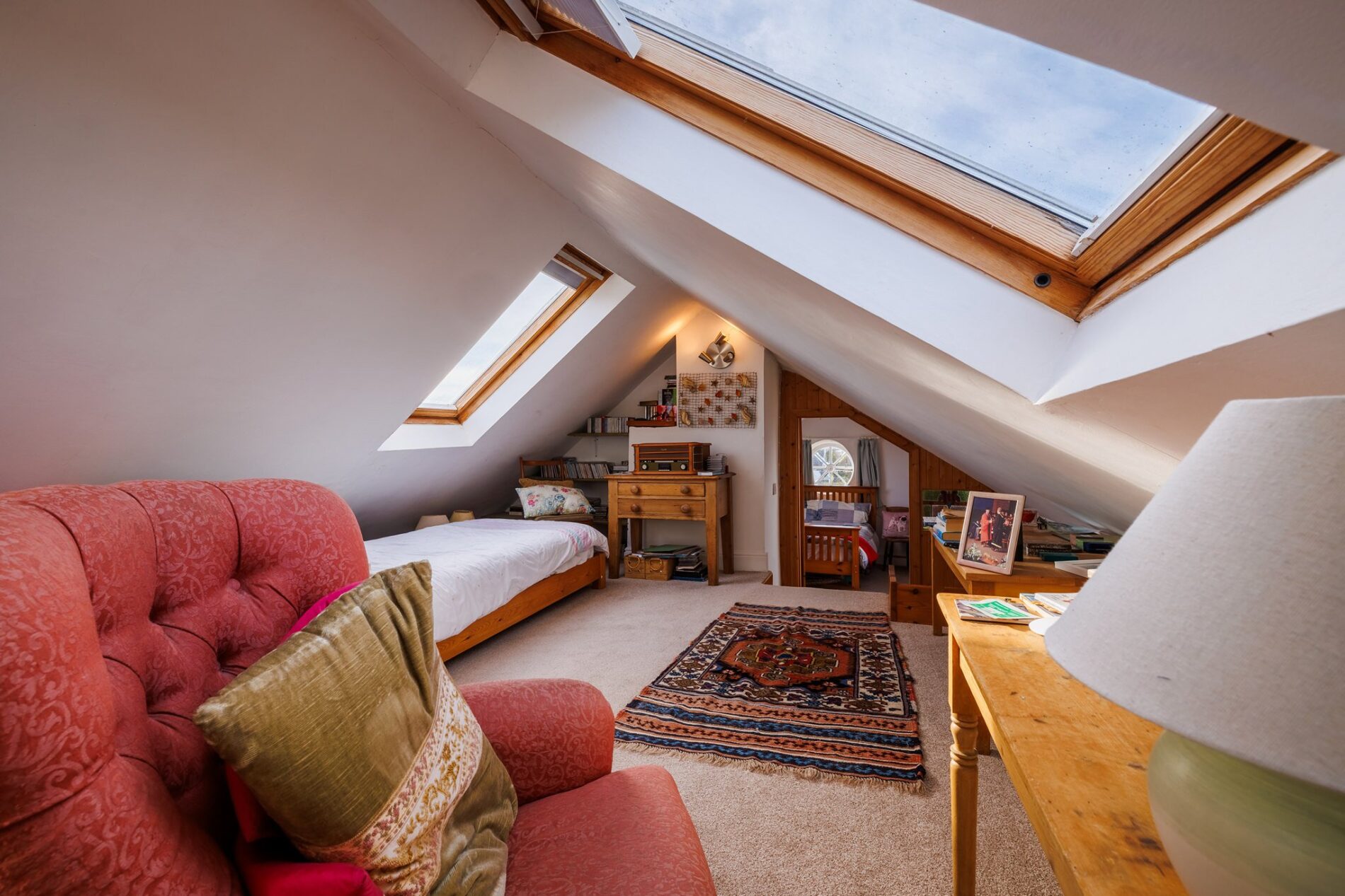 Climbing the stairs to the top floor of the home, you find a door to a third double bedroom, which is packed with character. This space has sloping ceilings with rooflights to the front and rear, and a circular feature window at the far end.