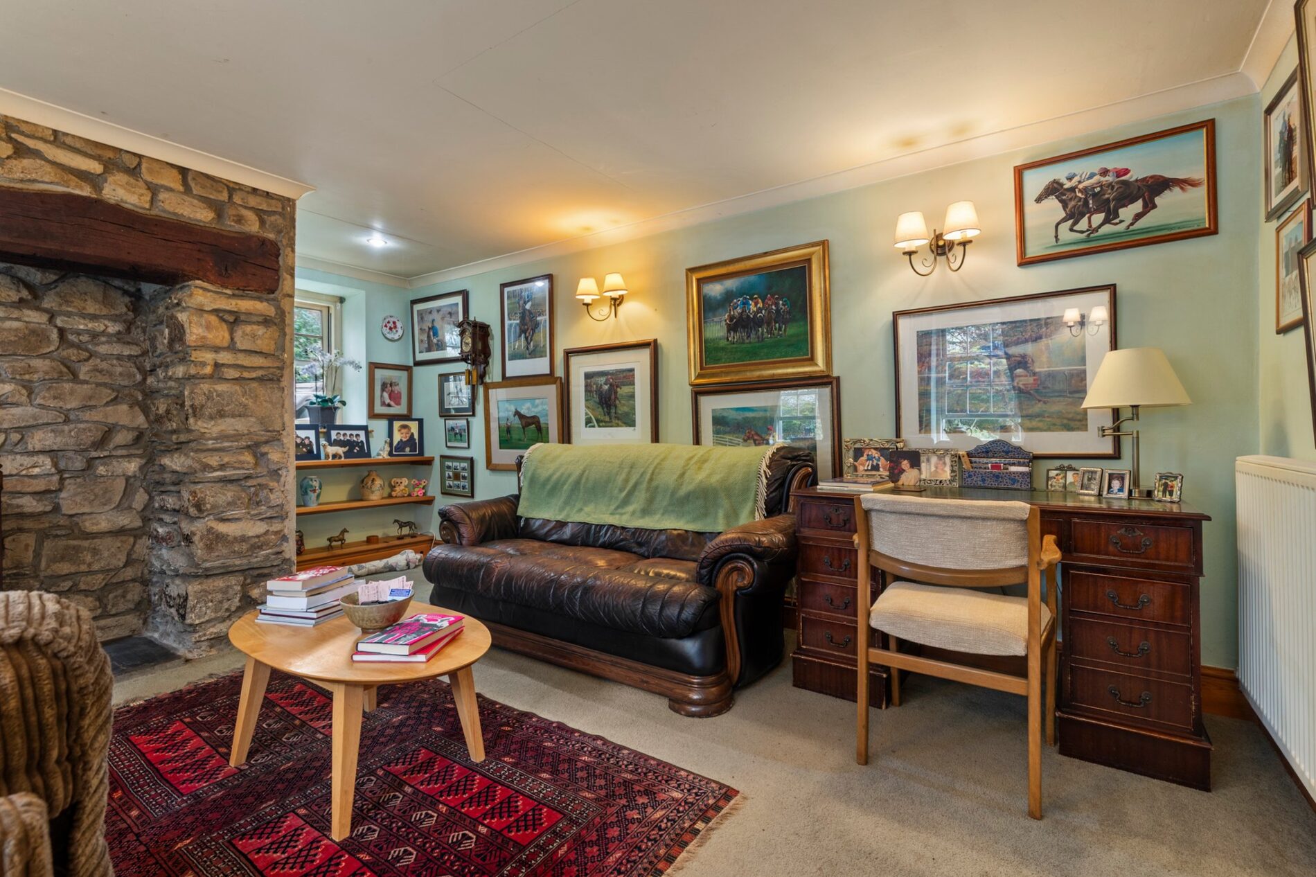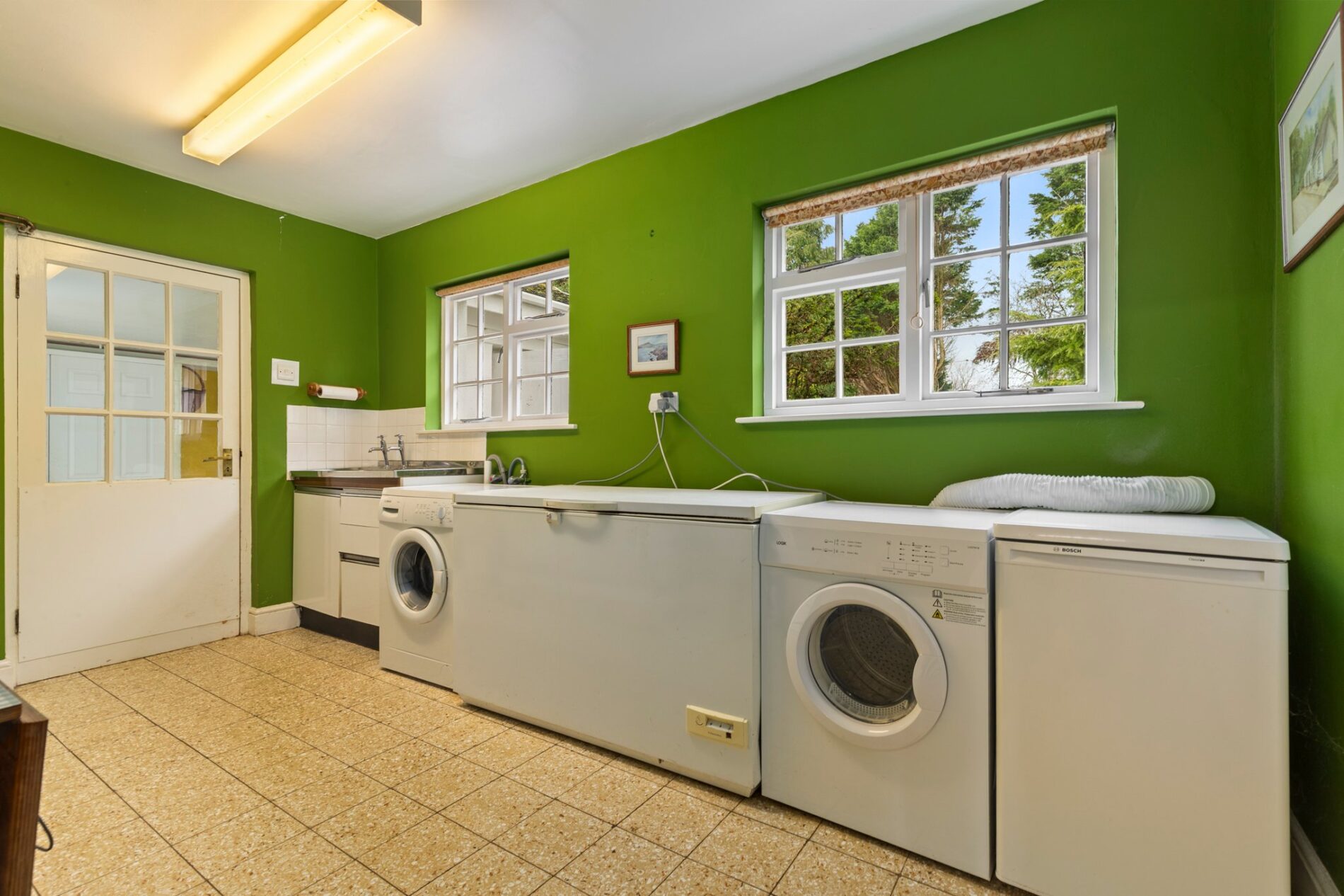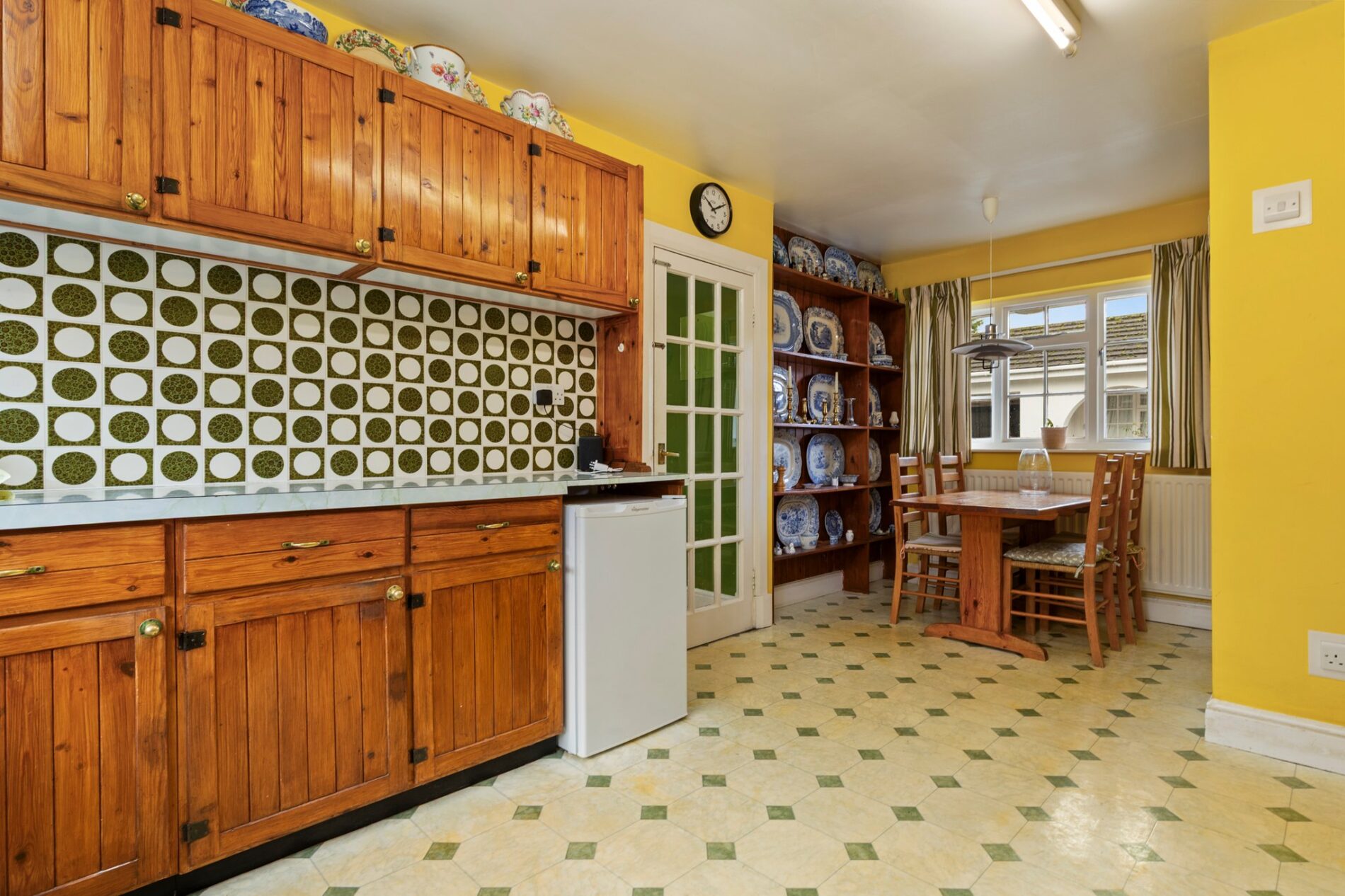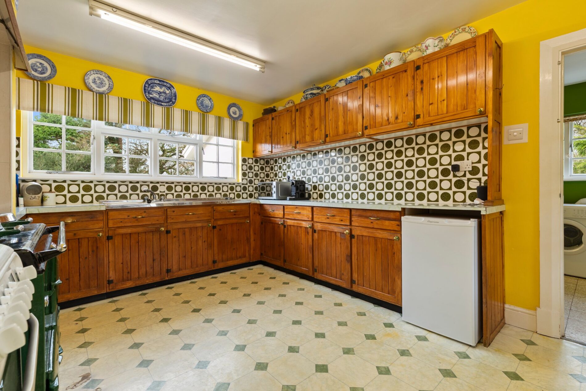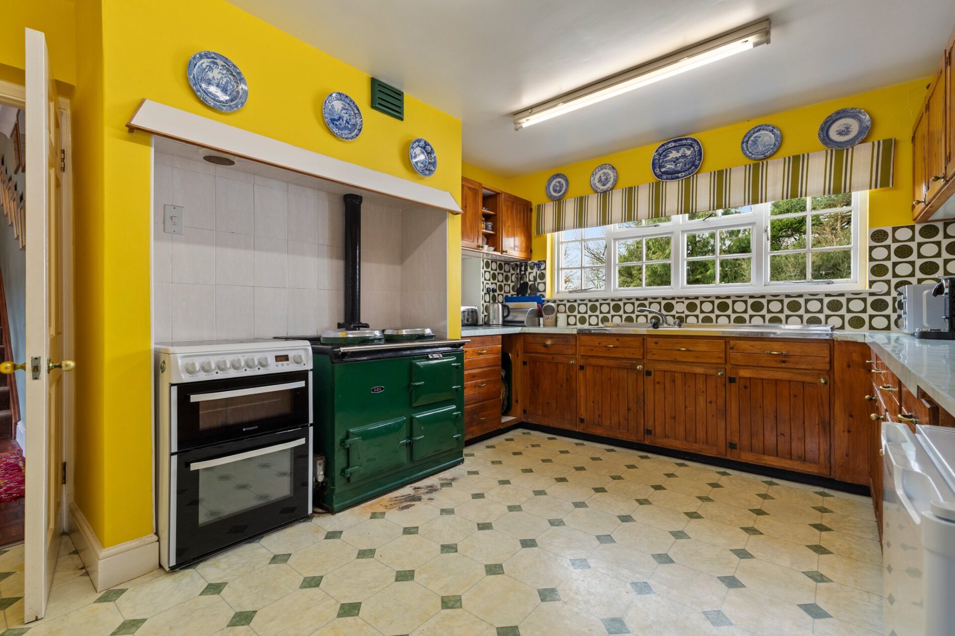 The kitchen features a great range of handcrafted wooden base and wall units, lending a warm and classic ambience. Dual-aspect windows illuminate the space, while a traditional Aga enhances both functionality and character. There is space for an informal dining area, with a door to the utility room in the far wall.