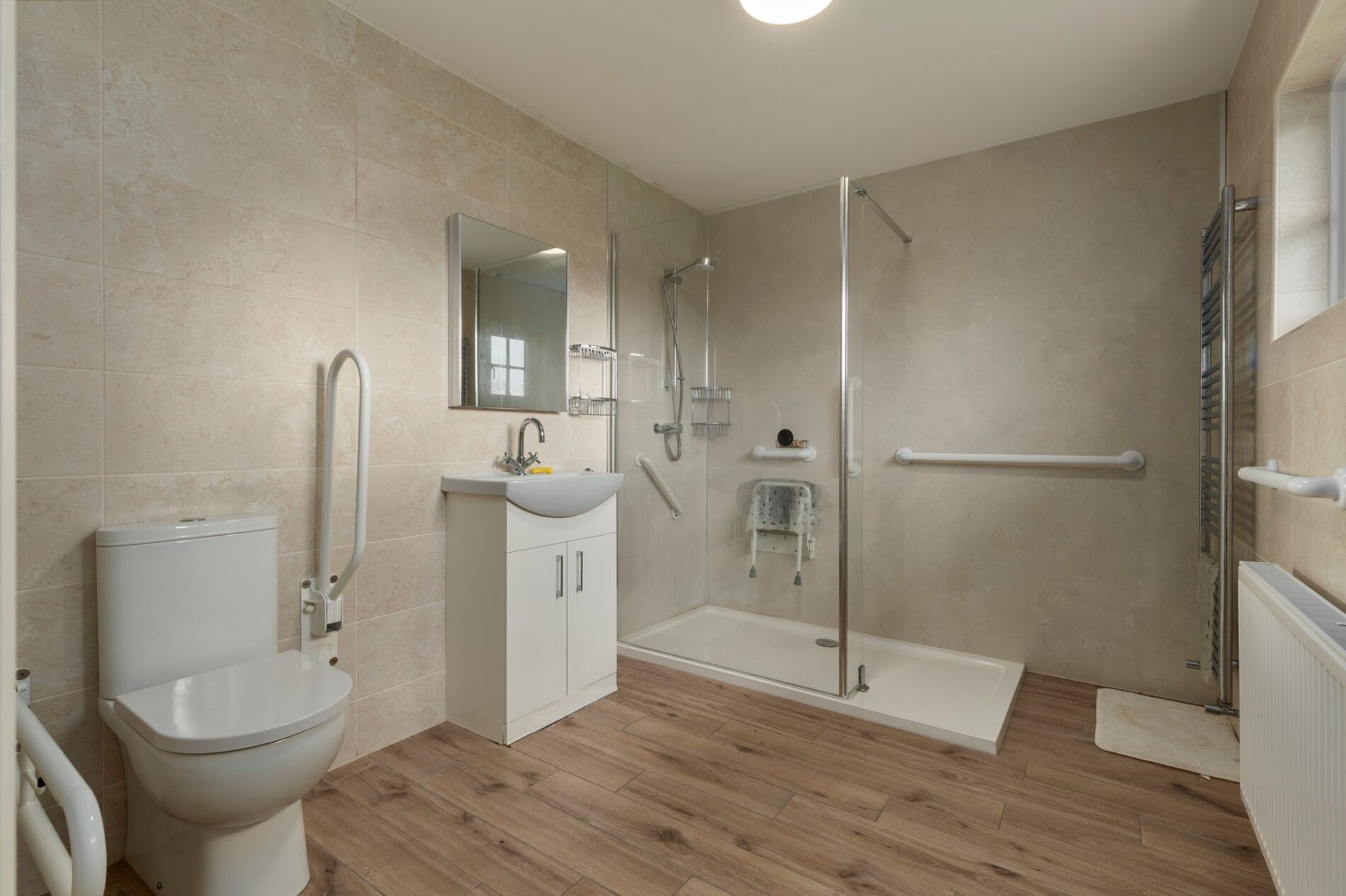 This large en-suite includes a walk-in shower, lavatory, and wash hand basin.