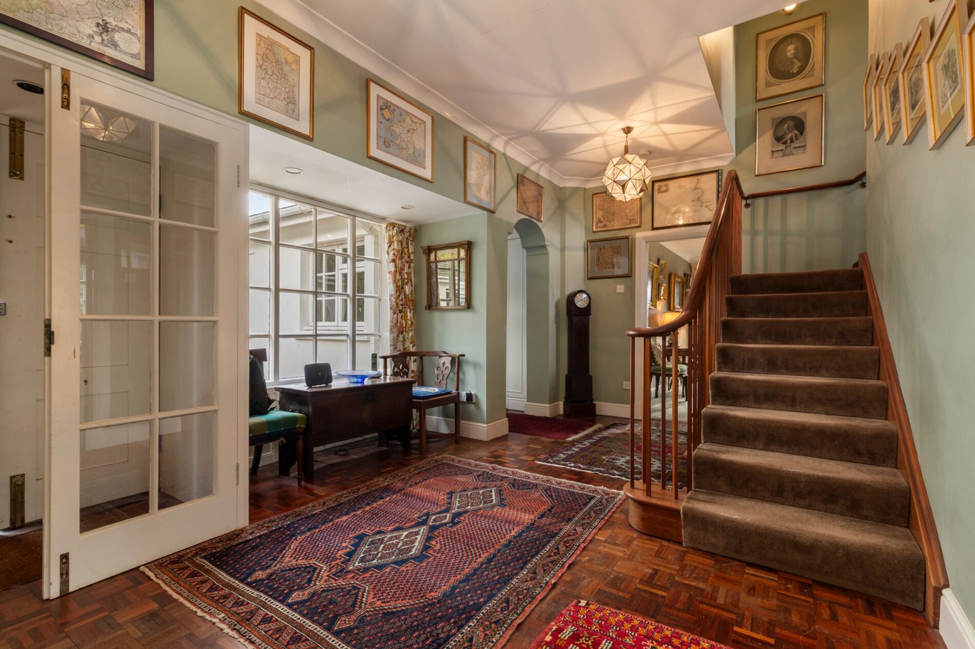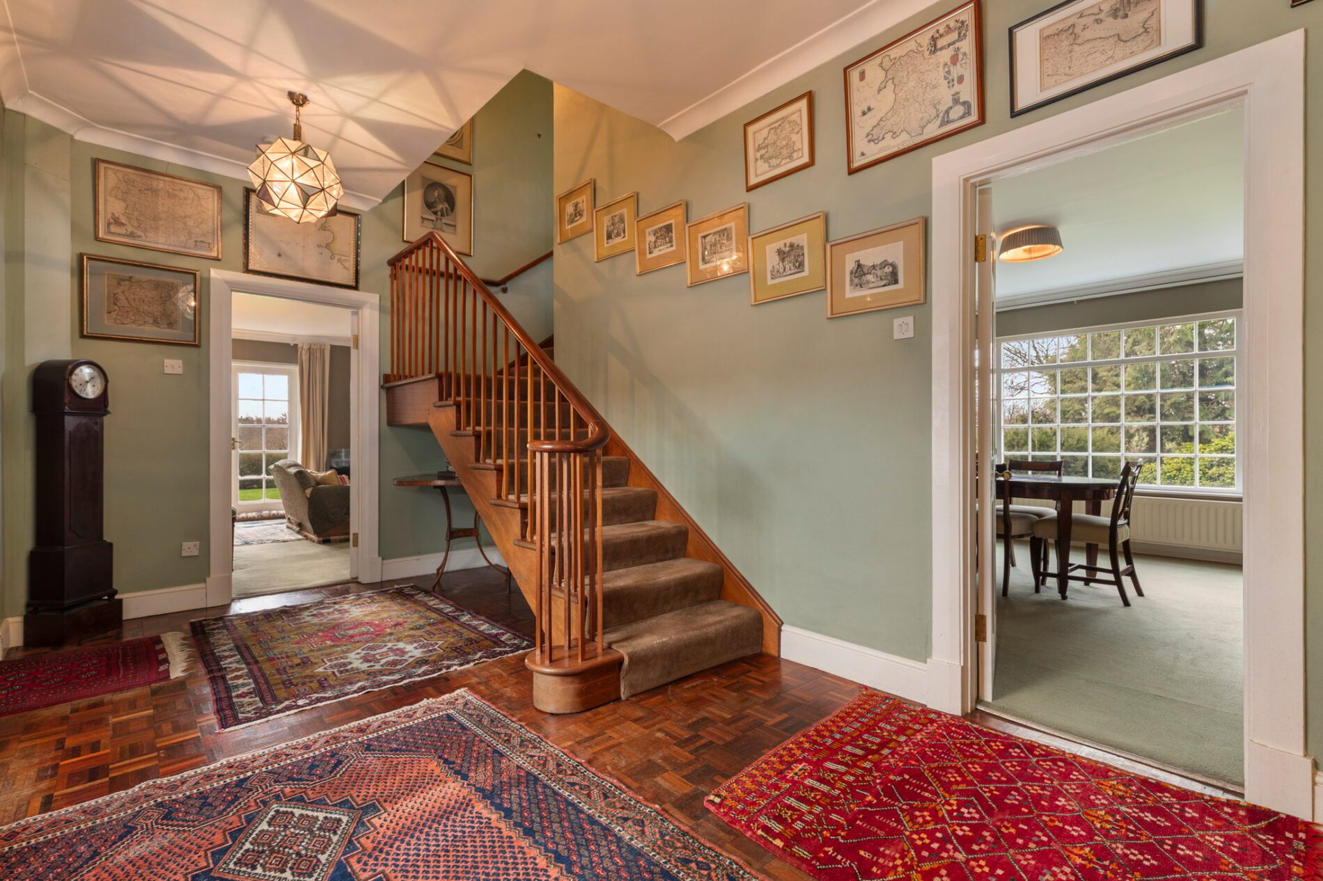 A solid wood front door opens into an inviting entrance hall with characterful parquet flooring, which leads through refined glass-panelled double doors into a spacious central hallway. This central hallway is a superb feature of the property, benefiting from high ceilings, a large panel window that floods the space with natural light, and a beautifully crafted wooden staircase which leads up to the first floor. There are doors to the principal reception spaces and a hallway continuing around to the left.