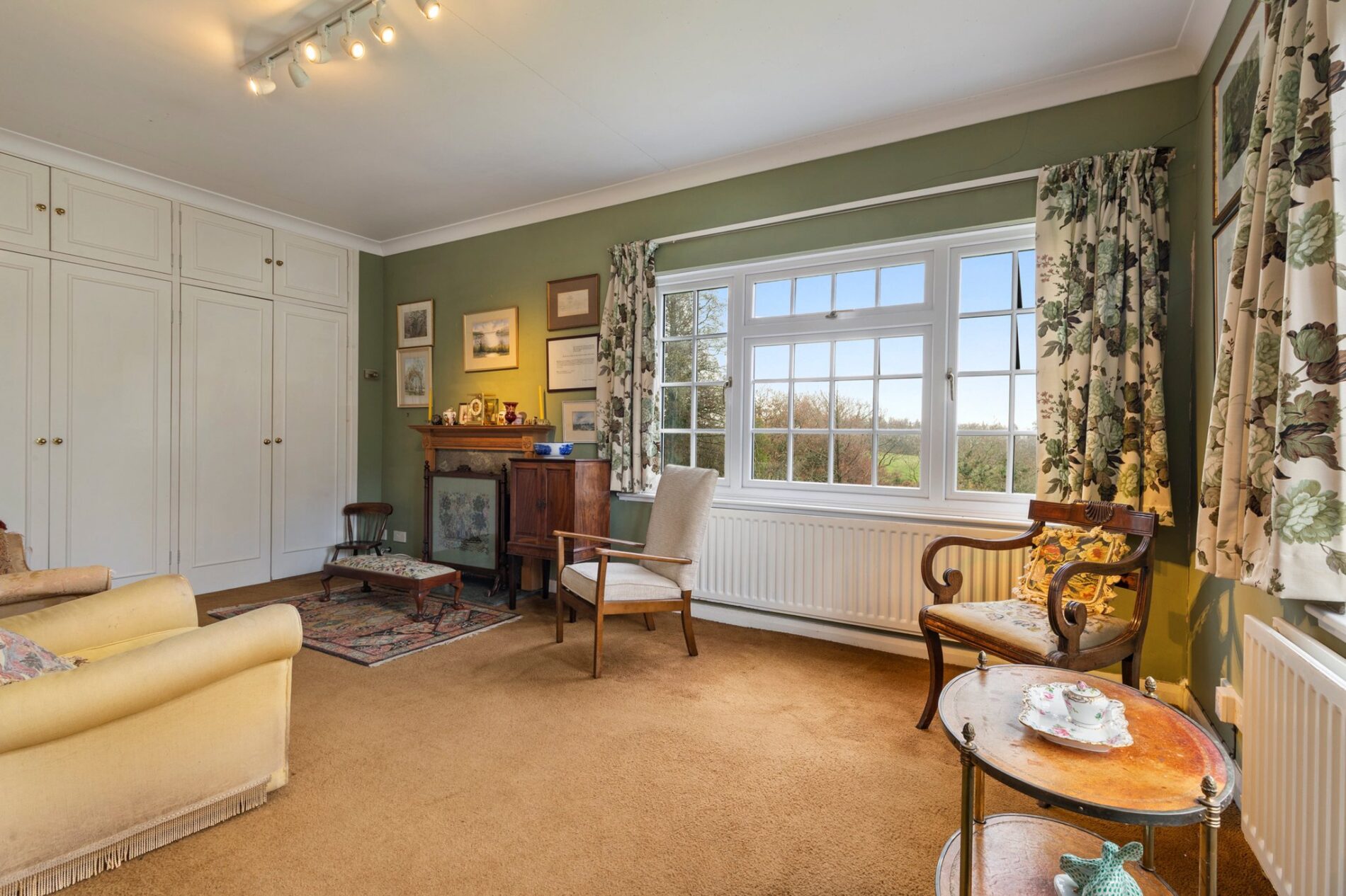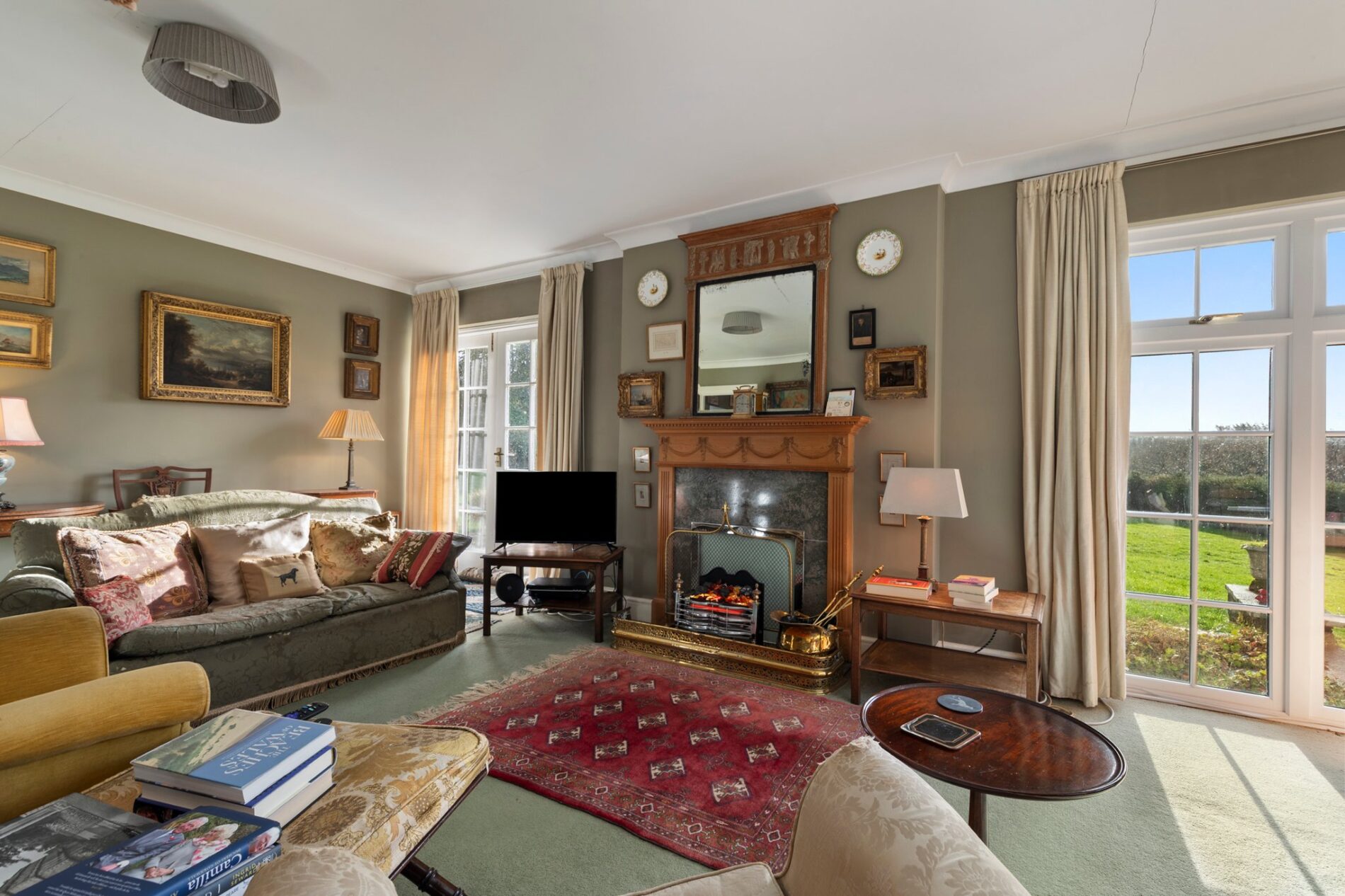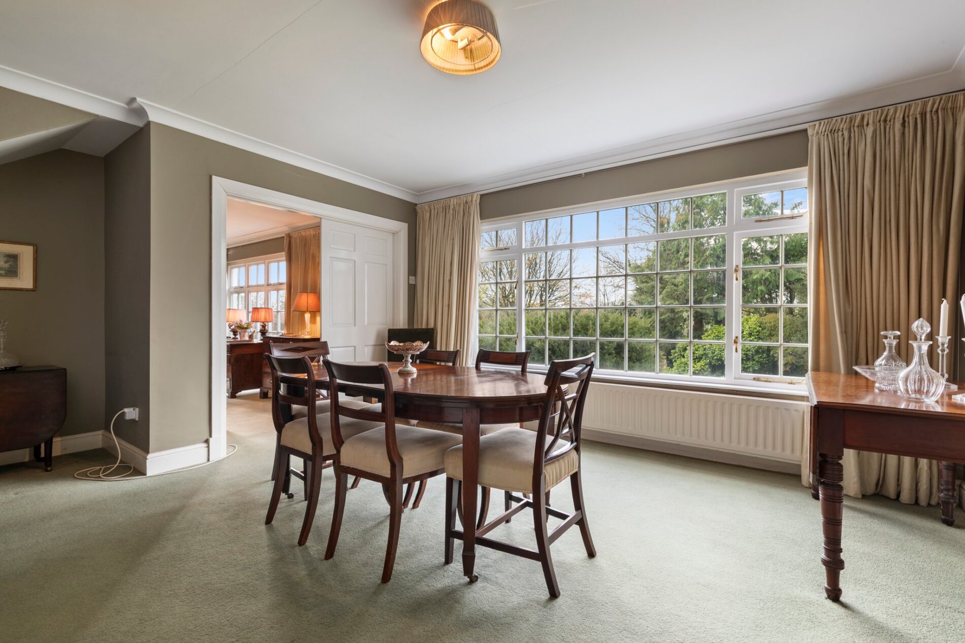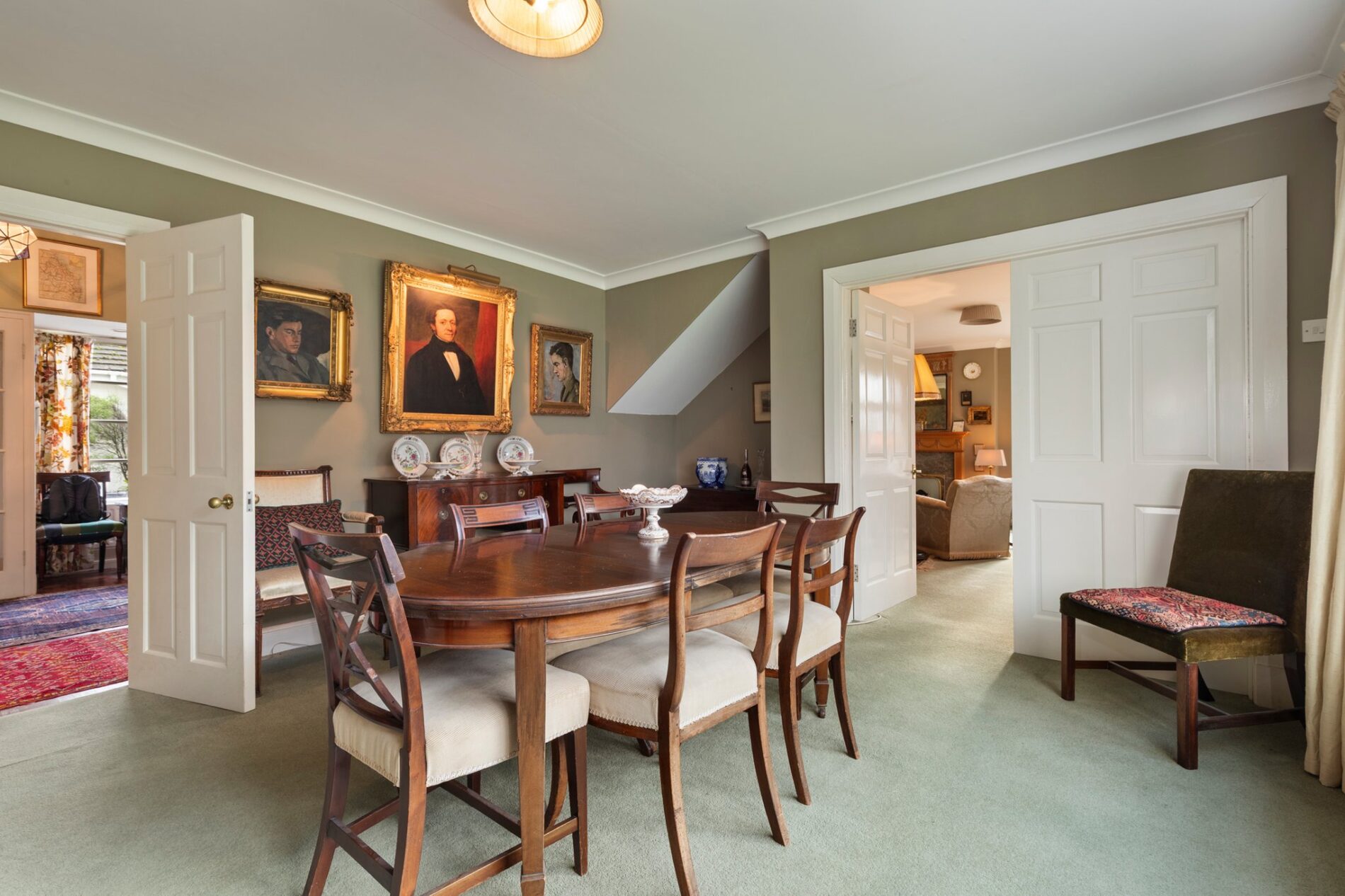 The principal reception room in the property, this charming sitting room benefits from two graceful floor-length windows and a set of patio doors offering views and direct access to the expansive garden. A charming traditional fireplace provides a warm and inviting focal point within this generous living space. Double inner doors open to the dining room.