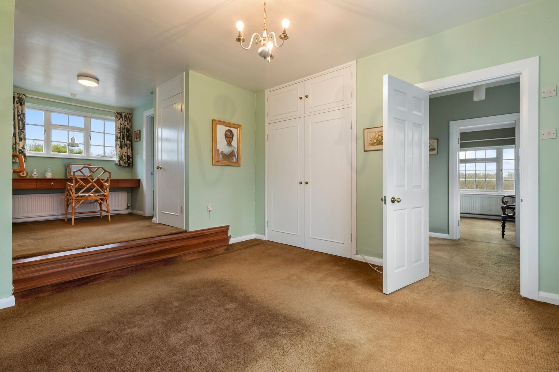 A spacious room featuring three windows that offer abundant natural light, as well as generous built-in storage and wardrobes, plus an airing cupboard. A step leads up to an elevated dressing area which gives access to the en-suite bathroom.