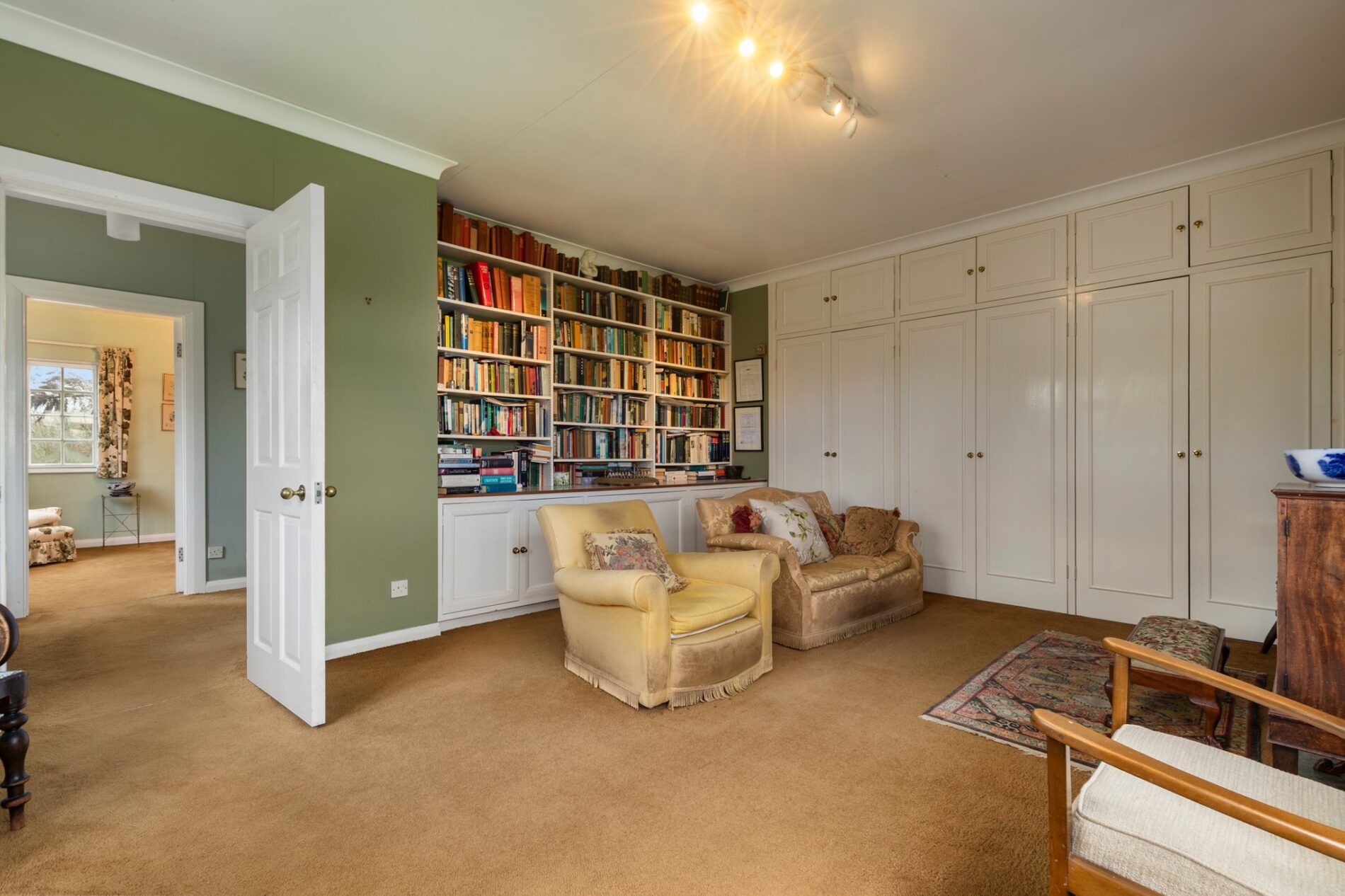 This characterful room includes a large built-in bookshelf along one wall, a fireplace with ornate decorative surround, two generous windows, and extensive built-in storage. While currently set up as a wonderful library, this space could easily provide an additional bedroom for the home.