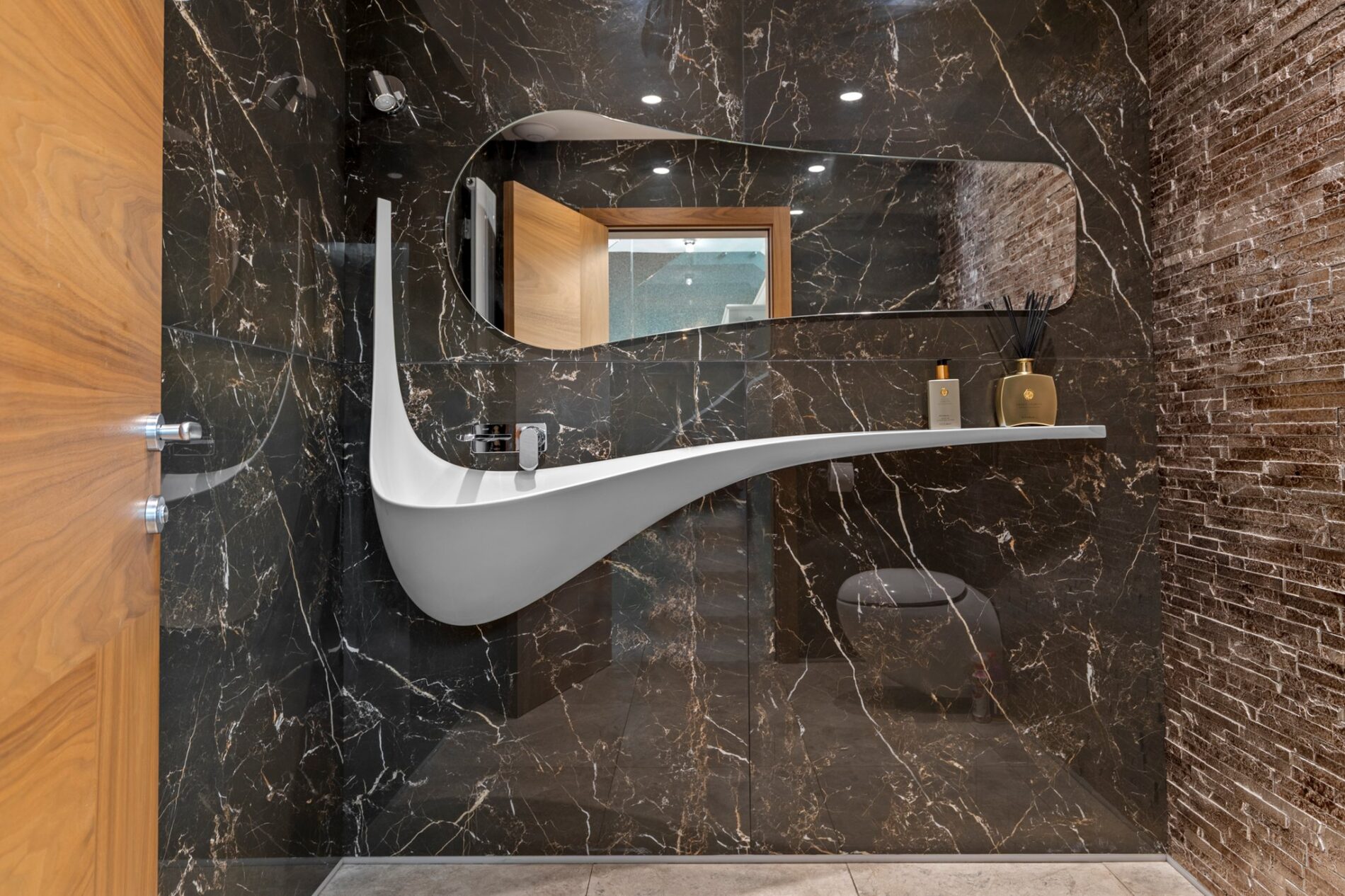 This cloakroom serves this level of the home and offers a feature sink, wall-mounted lavatory, and high quality tiling to the walls and floor.