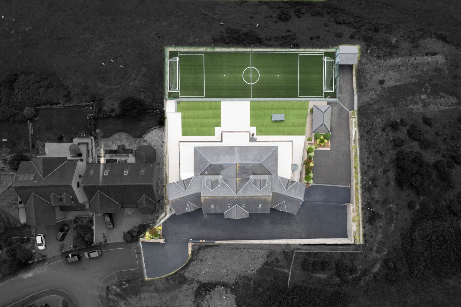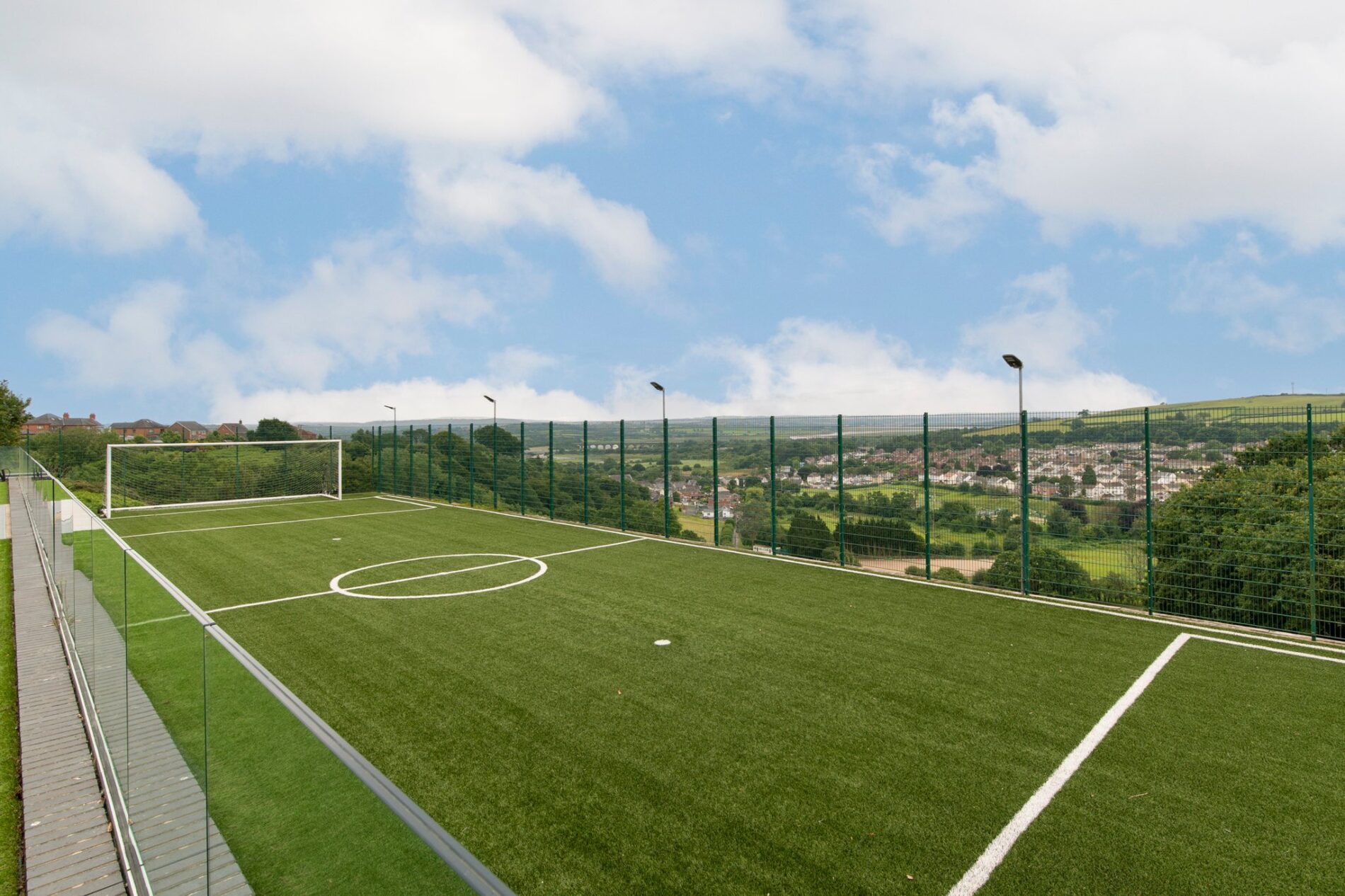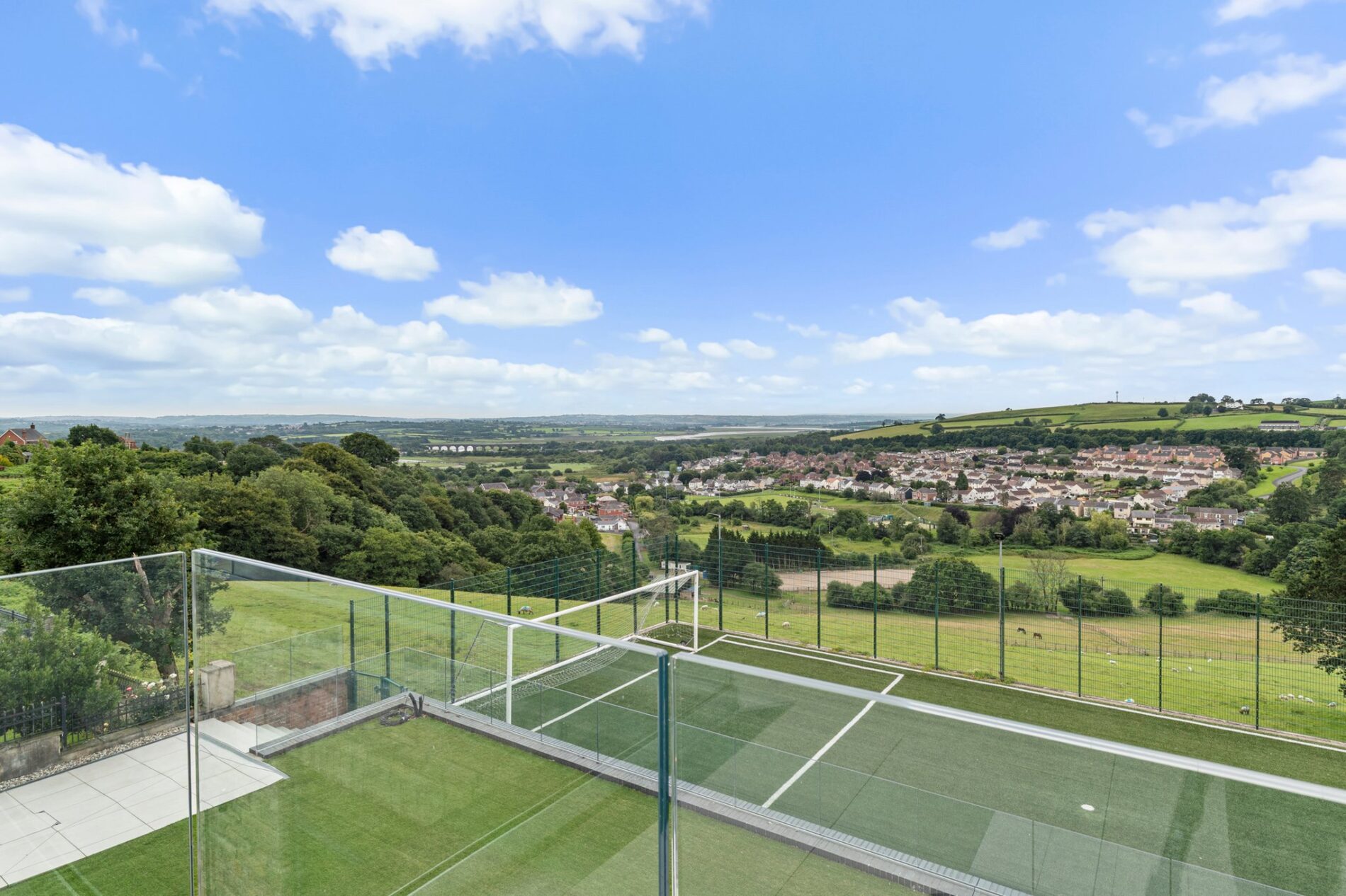 Externally, the property continues to impress. A substantial driveway secured behind electric gates provides access to the two integral garages and rear gardens. The terraced grounds are perfect for both relaxation and recreation, featuring expansive entertaining spaces, a covered outdoor kitchen, and a professionally finished 4G football pitch, complete with 2 sets of full sized FIFA approved goal posts.