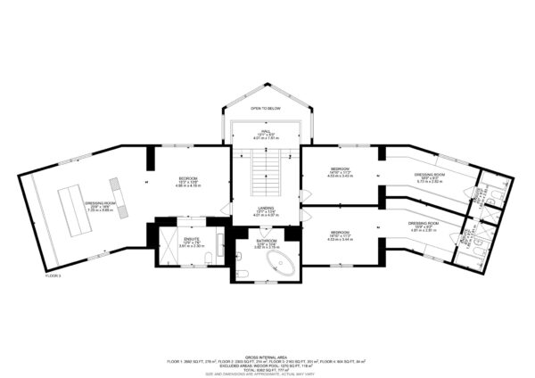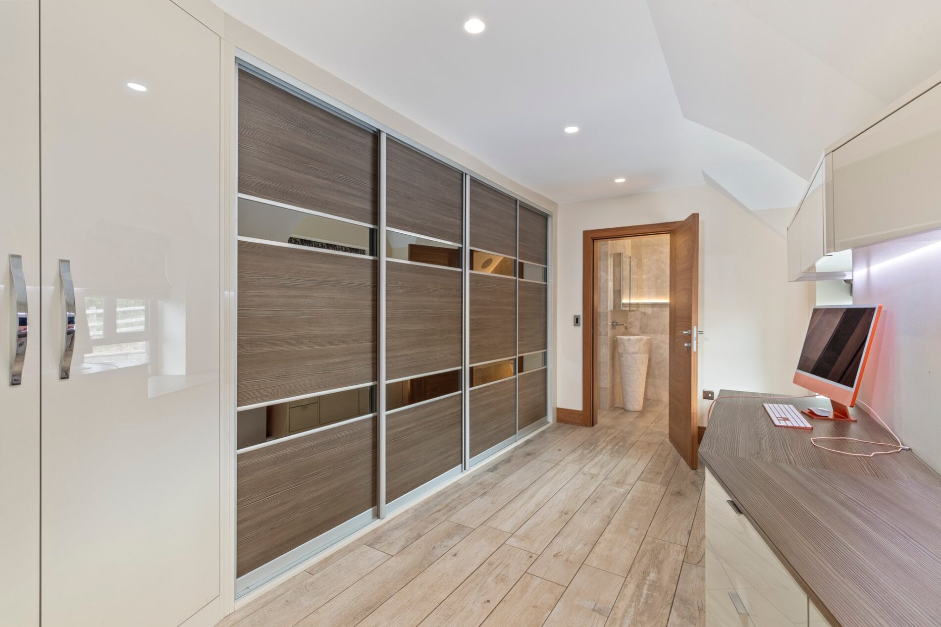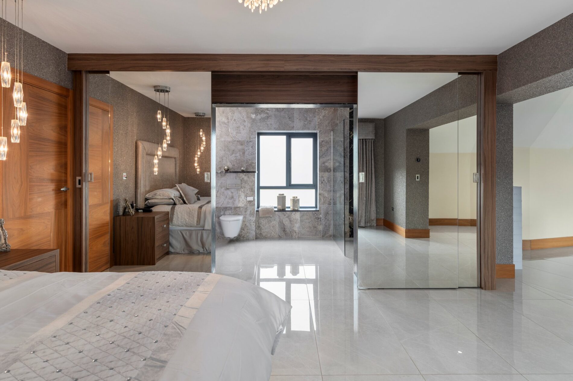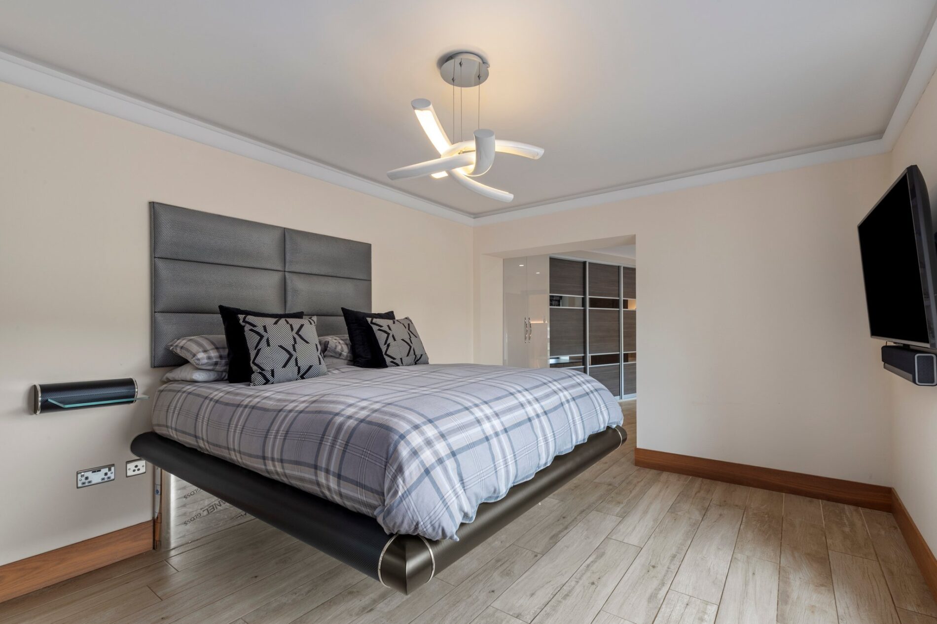 The master bedroom offers a stunning space which has a feature fire at its centre. The room has window to the front and rear and opens into a massive dressing room with all the storage an owner could ever need. Sliding mirrored doors open into the ensuite shower room.