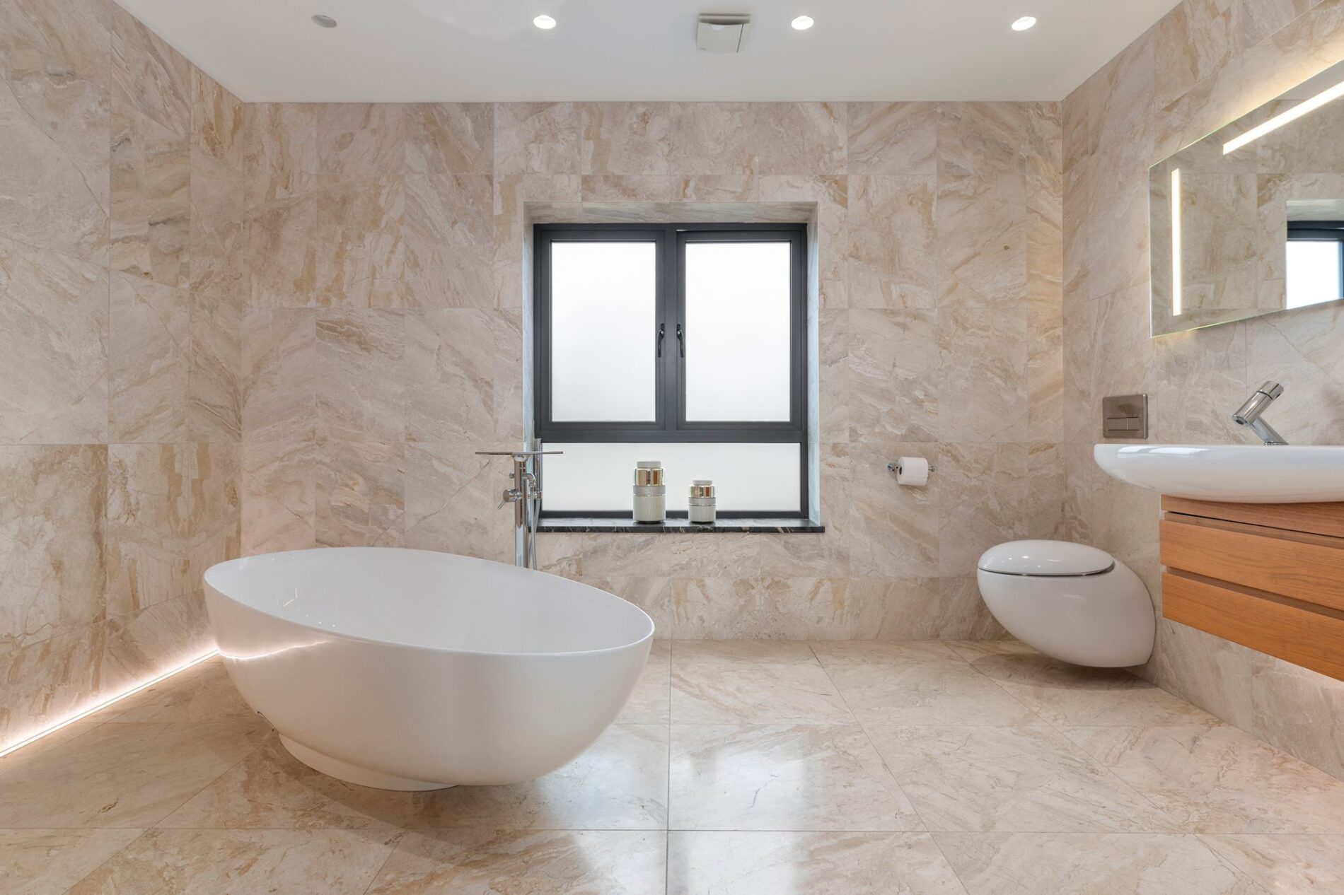 The family bathroom is found next to the master and offers a feature, freestanding bath, lavatory, and double hand basin set into a floating vanity unit. The room is beautifully finished with tiling to the walls and floor and has inset lighting and a television set into the wall.