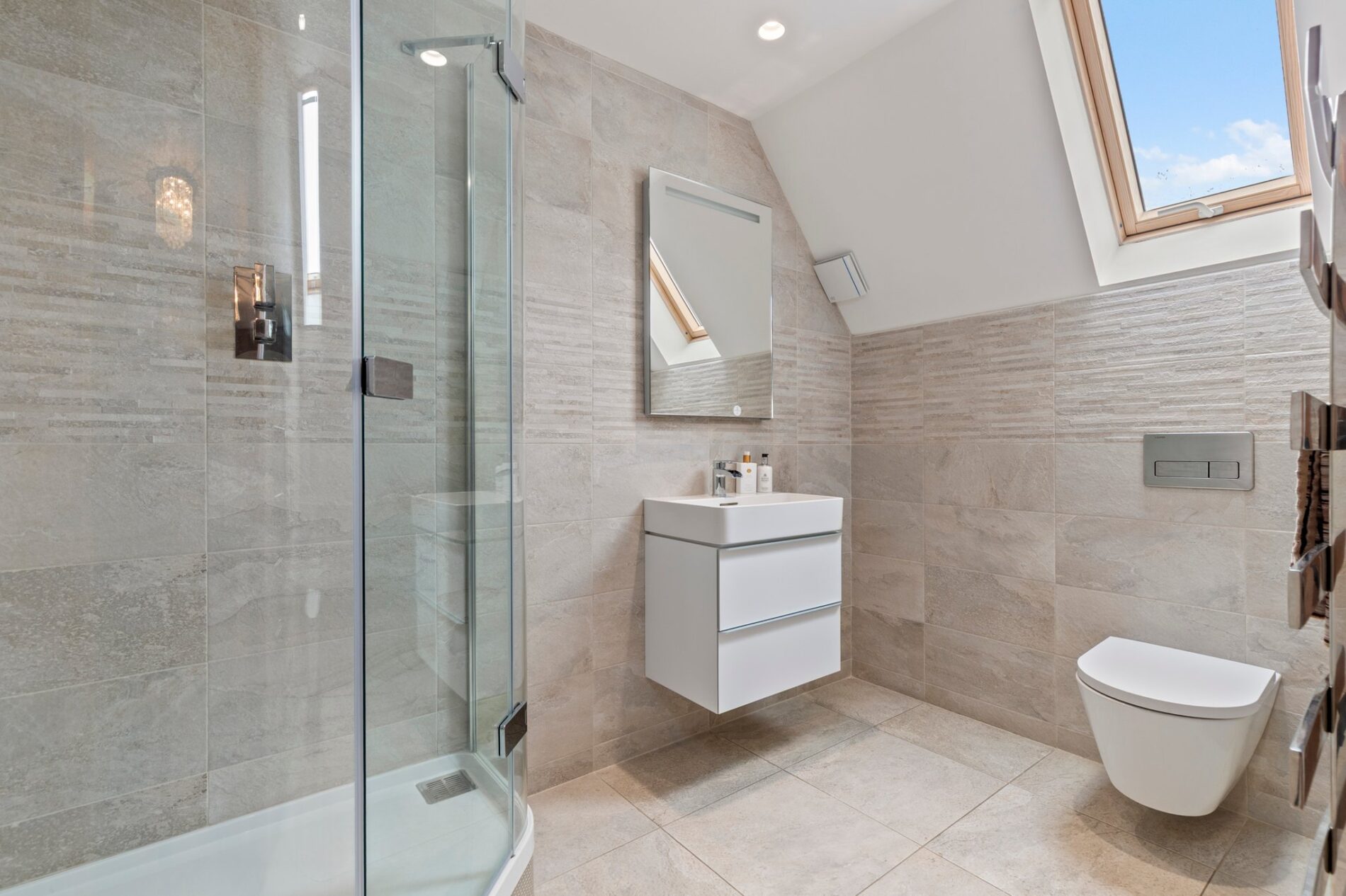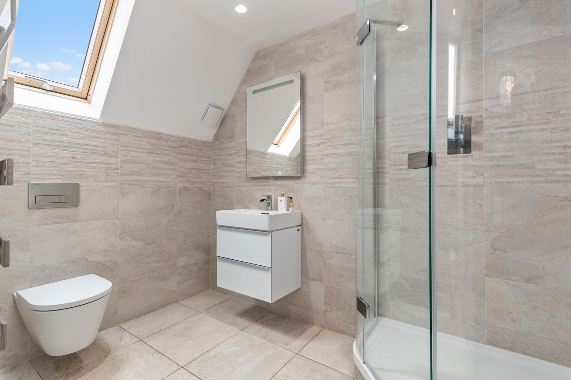 Again, mirroring it neighbour, this space offers a large corner shower, lavatory, and hand basin, along with a rooflight in the ceiling above.