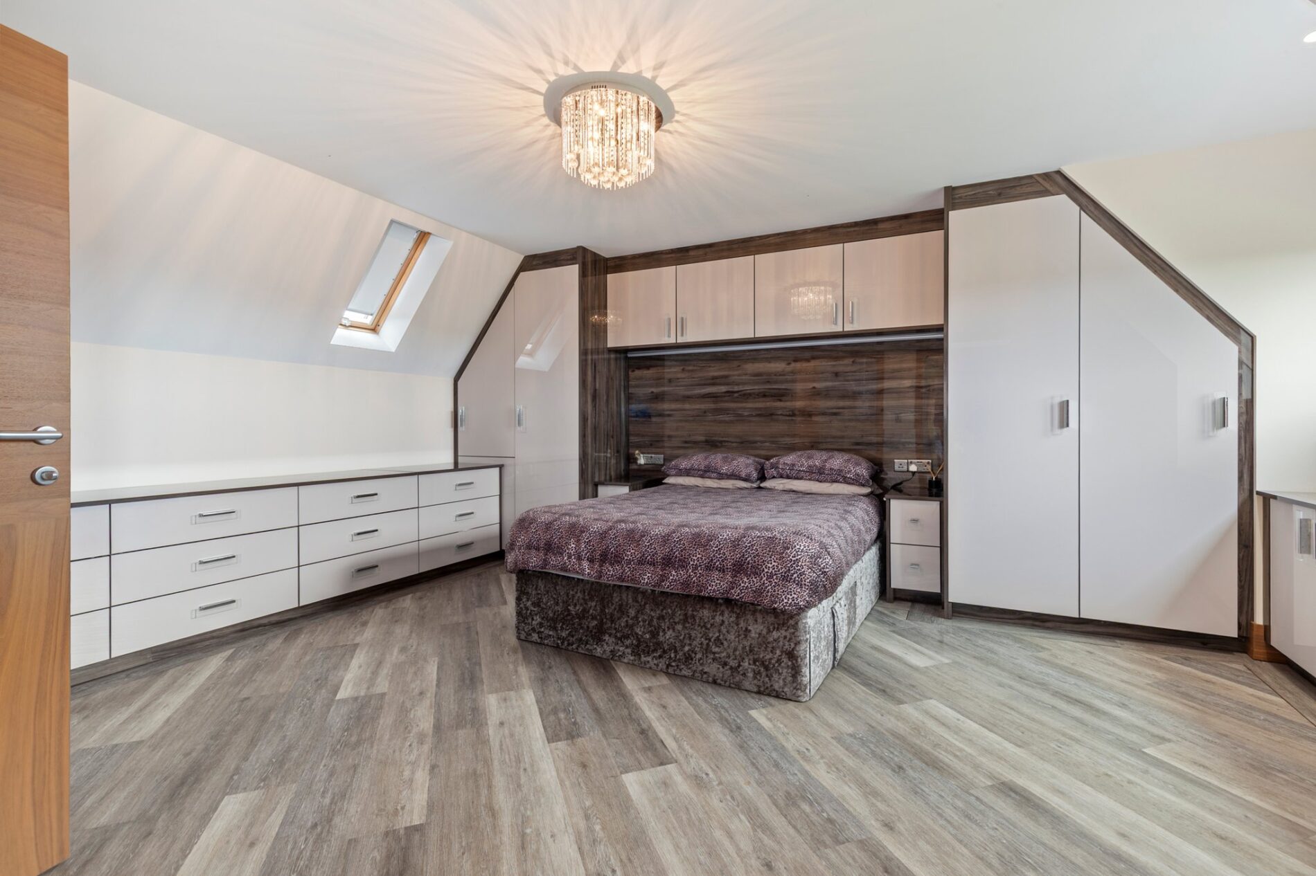 This large double offers fantastic accommodation with a huge range of fitted storage, window to the rear, a rooflight to the front, and a door to the ensuite shower room on the inner wall.