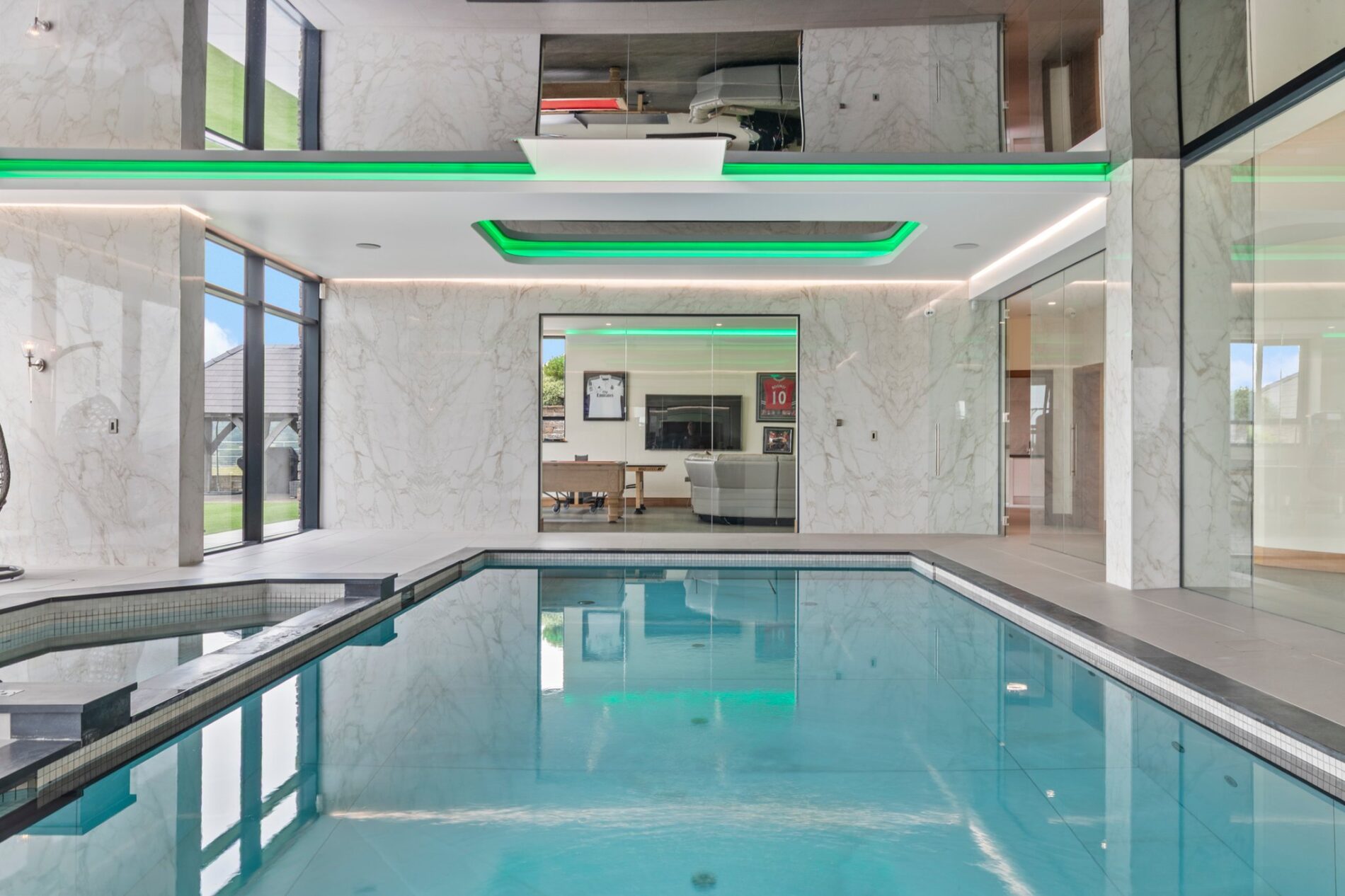 Spanning four levels, the property’s lower ground floor is dedicated to exceptional leisure facilities. At its heart lies a luxurious indoor heated swimming pool, complete with an integrated Jacuzzi, concealed cover, Fastlane swimming system, and a striking stretched ceiling with skylights into the reception area above. Surrounding the pool are large glass windows with views and access to the gardens at the rear. Completing the leisure facilities on this level you find a large games room and a state-of-the-art gym. This level also features an impressive sauna and separate steam room, along with well-appointed changing rooms and lavatories.