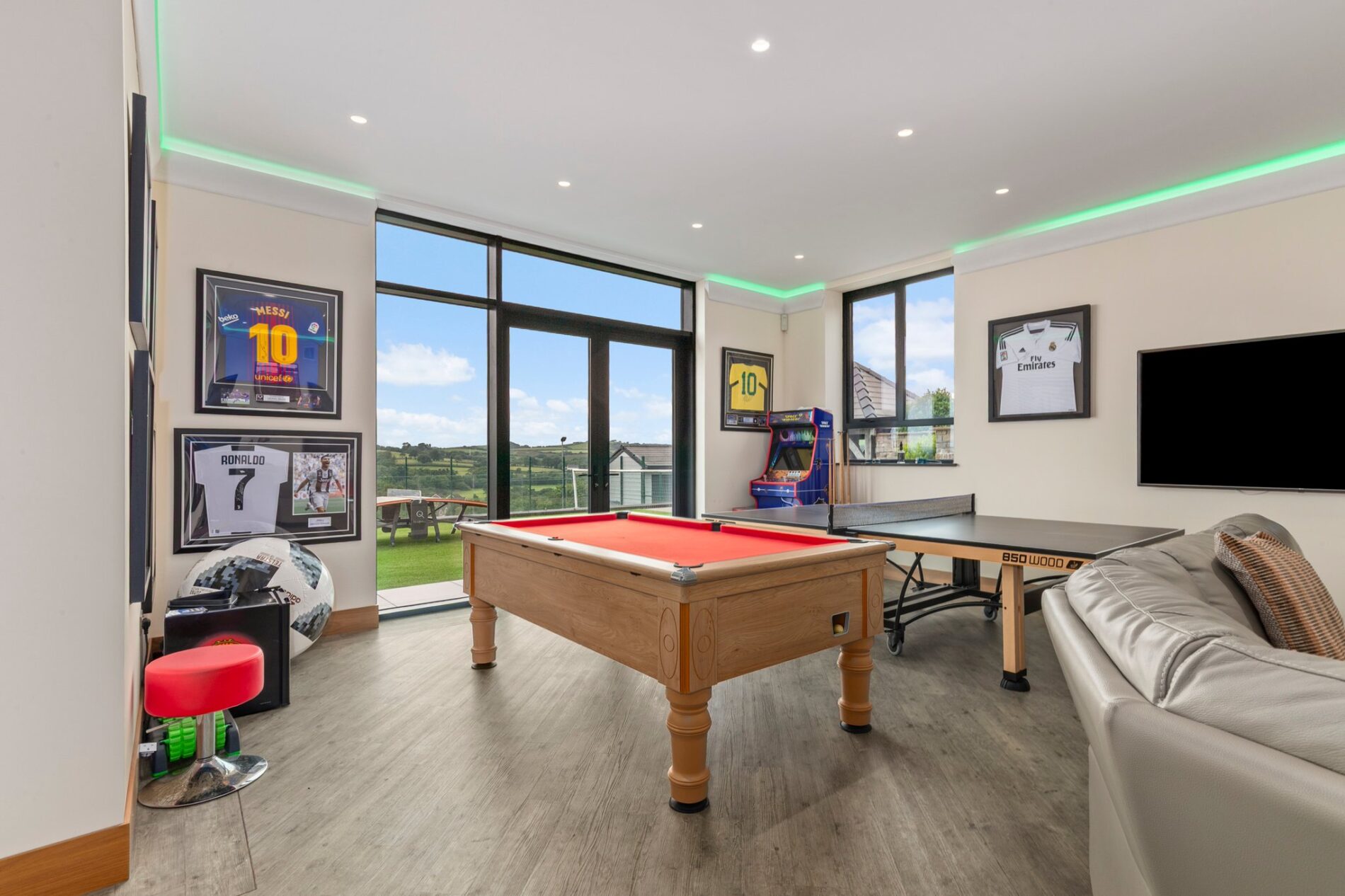 With full length windows to the pool and the rear gardens, this large space offers a superb games room with ample space for entertaining.