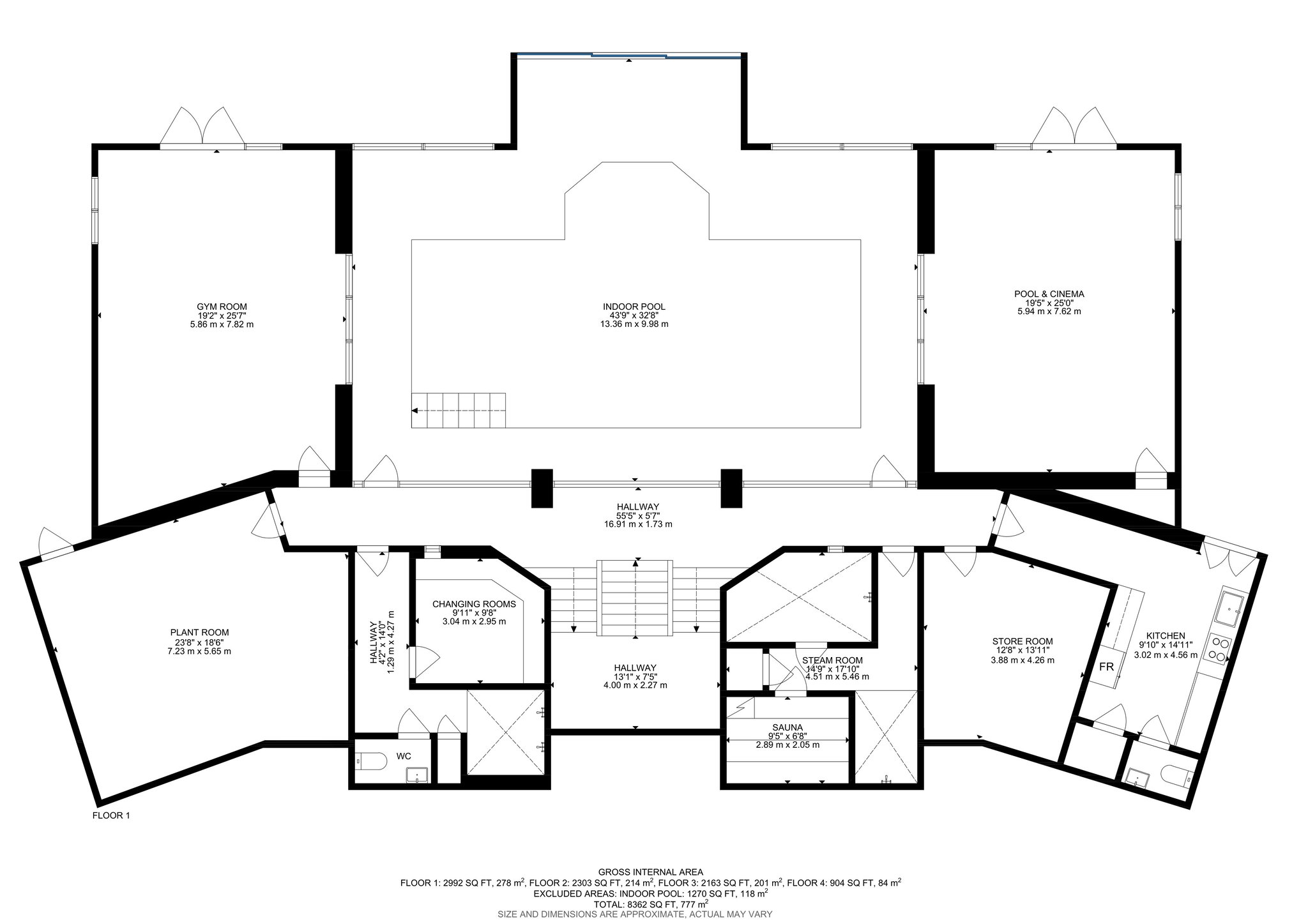 Additionally, there is a fully equipped chef’s kitchen, a substantial plant room, and a large storage room with the potential to be transformed into a home cinema.