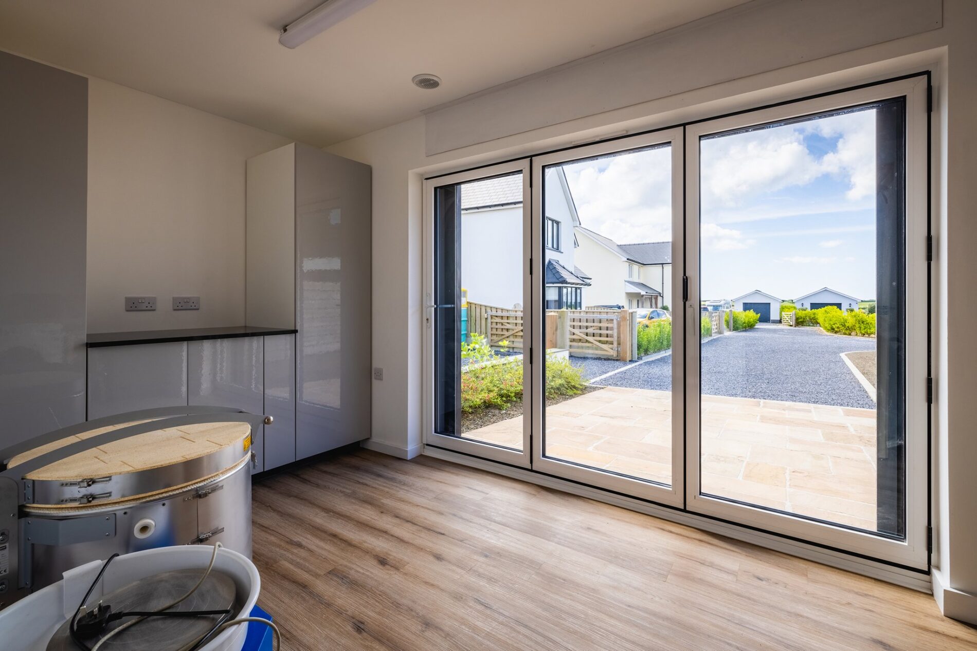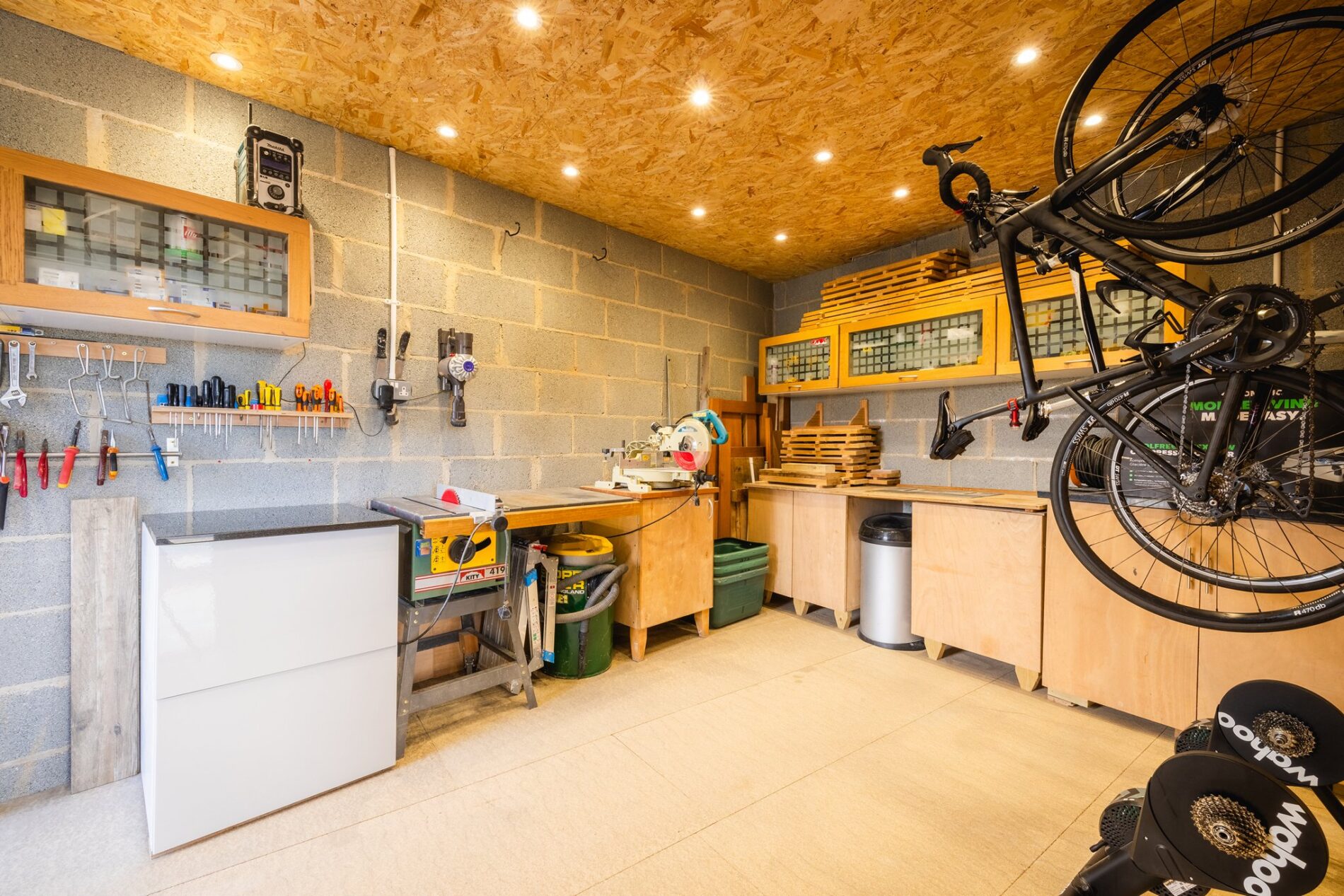 The garage has been converted and currently comprises two spaces, a workshop to the rear and a studio/gym to the front. The workshop is a great space for a hobbyist or creator and has a ladder leading up to storage in the eaves. The studio space to the front could fulfil a variety of uses and has cabinetry to both sides including plumbing for a washing machine. There are bifold doors leading out to the driveway in front of the building.