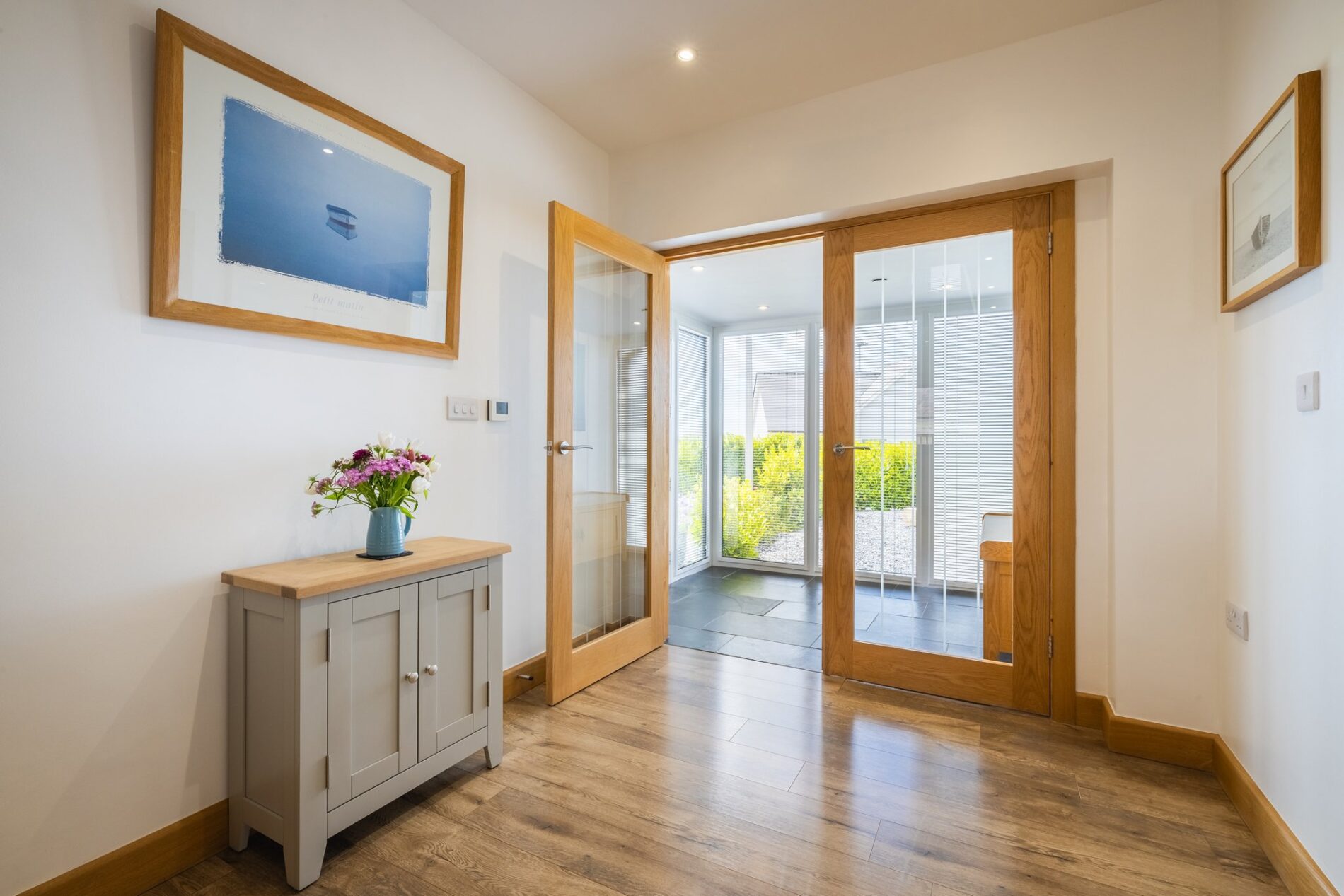 A composite door from the front gardens leads you into the enclosed entrance porch. This space is finished with slate tiles, with windows looking out over the front of the home and a pair of glazed double doors taking you into the main hallway.
