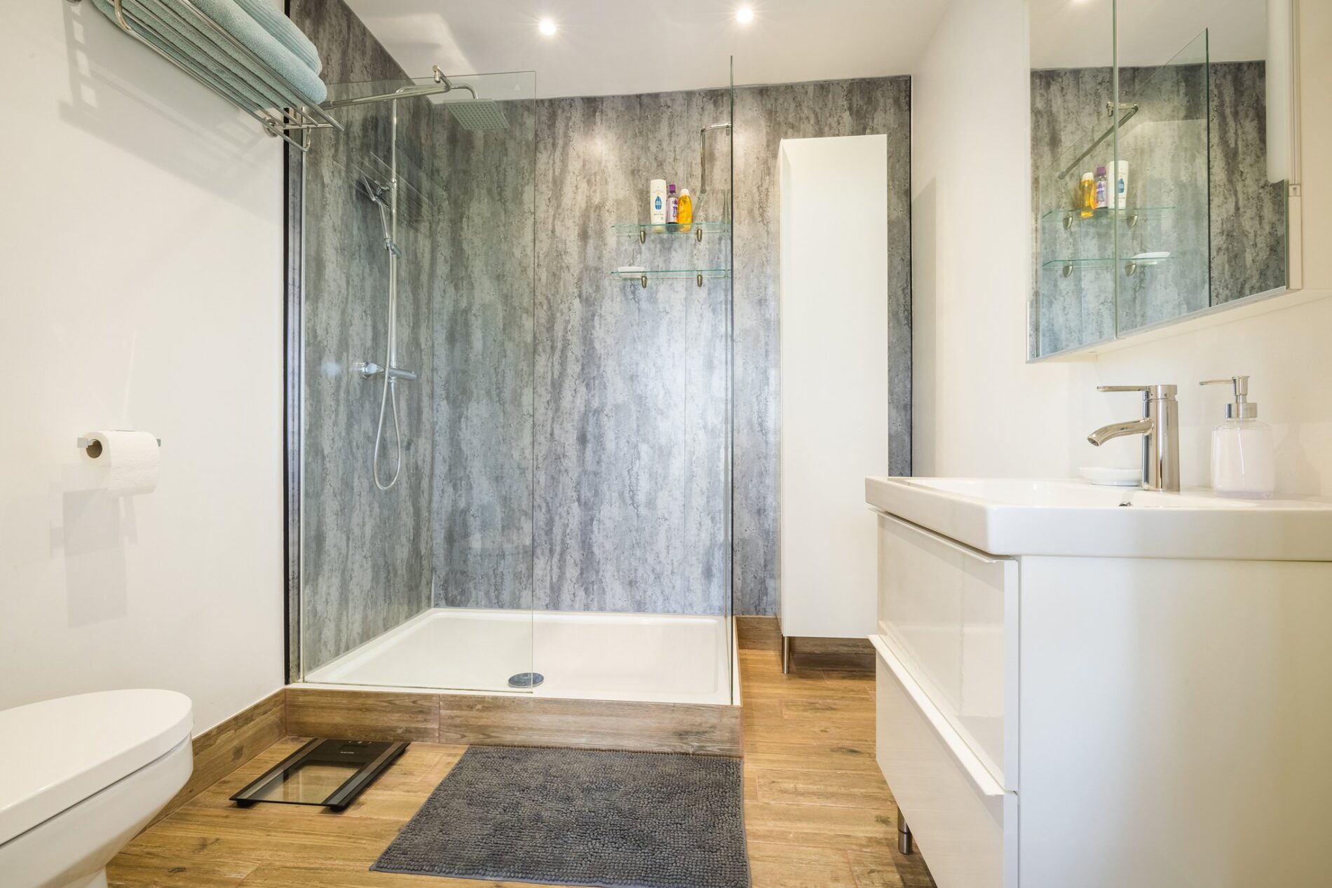 This well appointed shower room offers a walk in double shower, lavatory, storage and a hand basin set on a floating vanity.