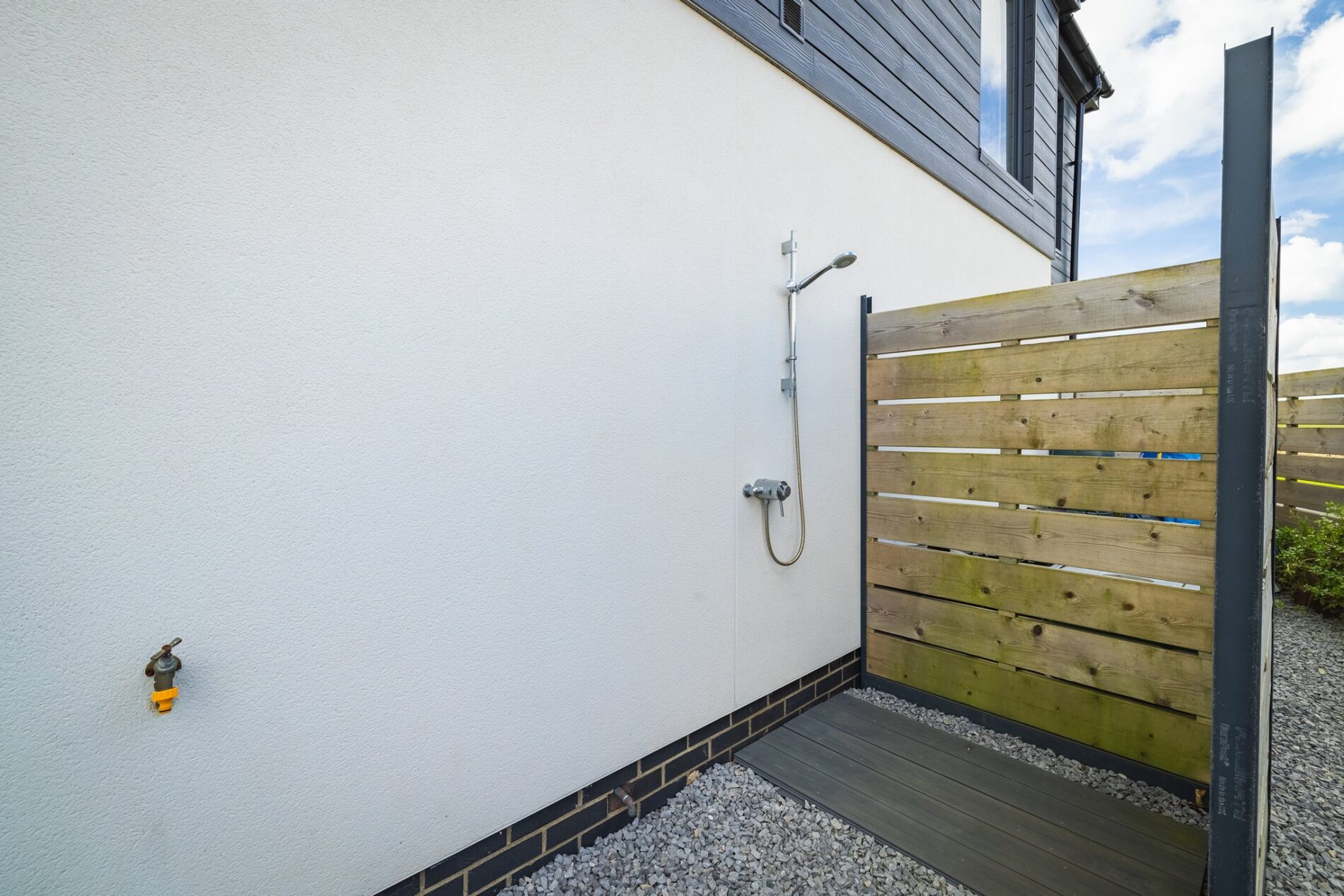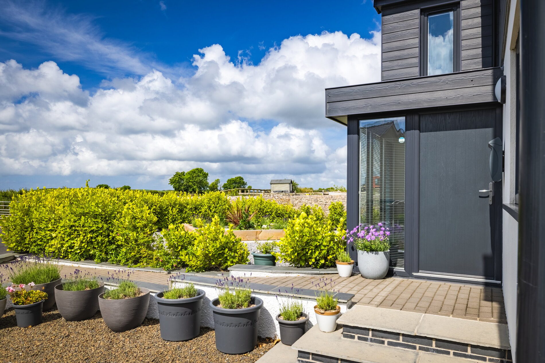 The rear of the home boasts a spacious, private garden that enjoys sunlight throughout the day. At the western end of the garden, you'll find a substantial shed, a hot tub area, and an outdoor shower attached to the house. The garden offers a great space combining seating and lawn areas with planting to the sides.