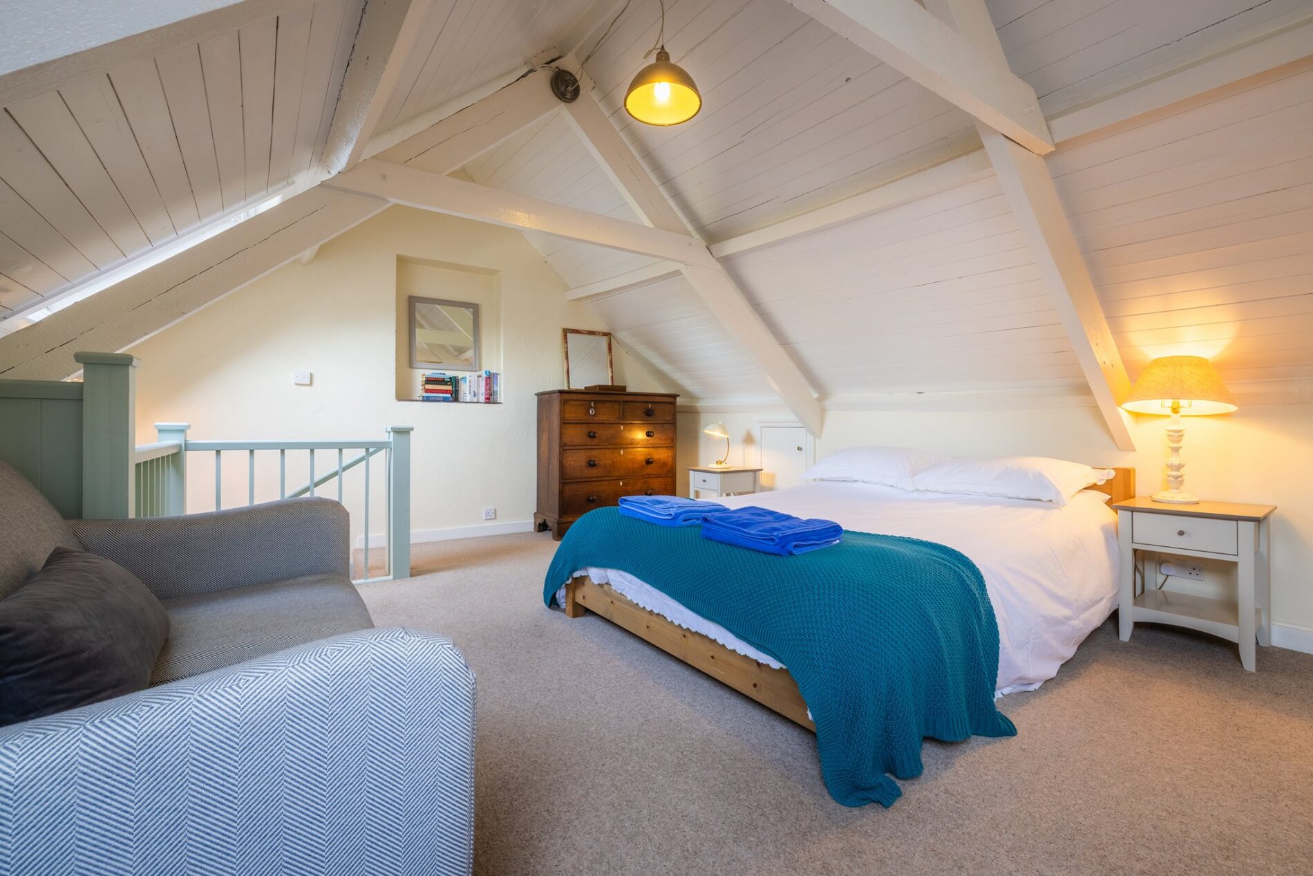 The master bedroom suite is accessed via its own staircase from the ground floor which brings you up to a short landing at the top of the stairs. The bedroom is an inviting space with a large window to the front and high ceilings with exposed A frame beams.