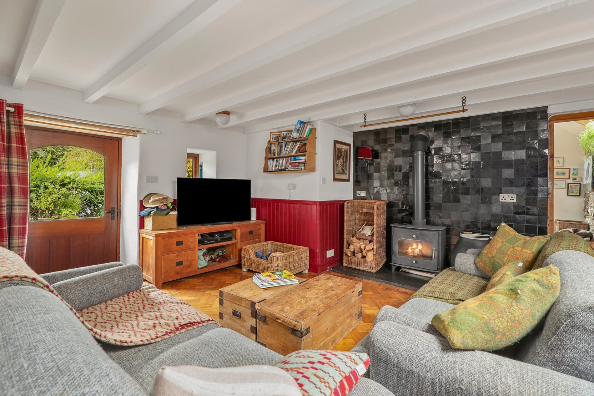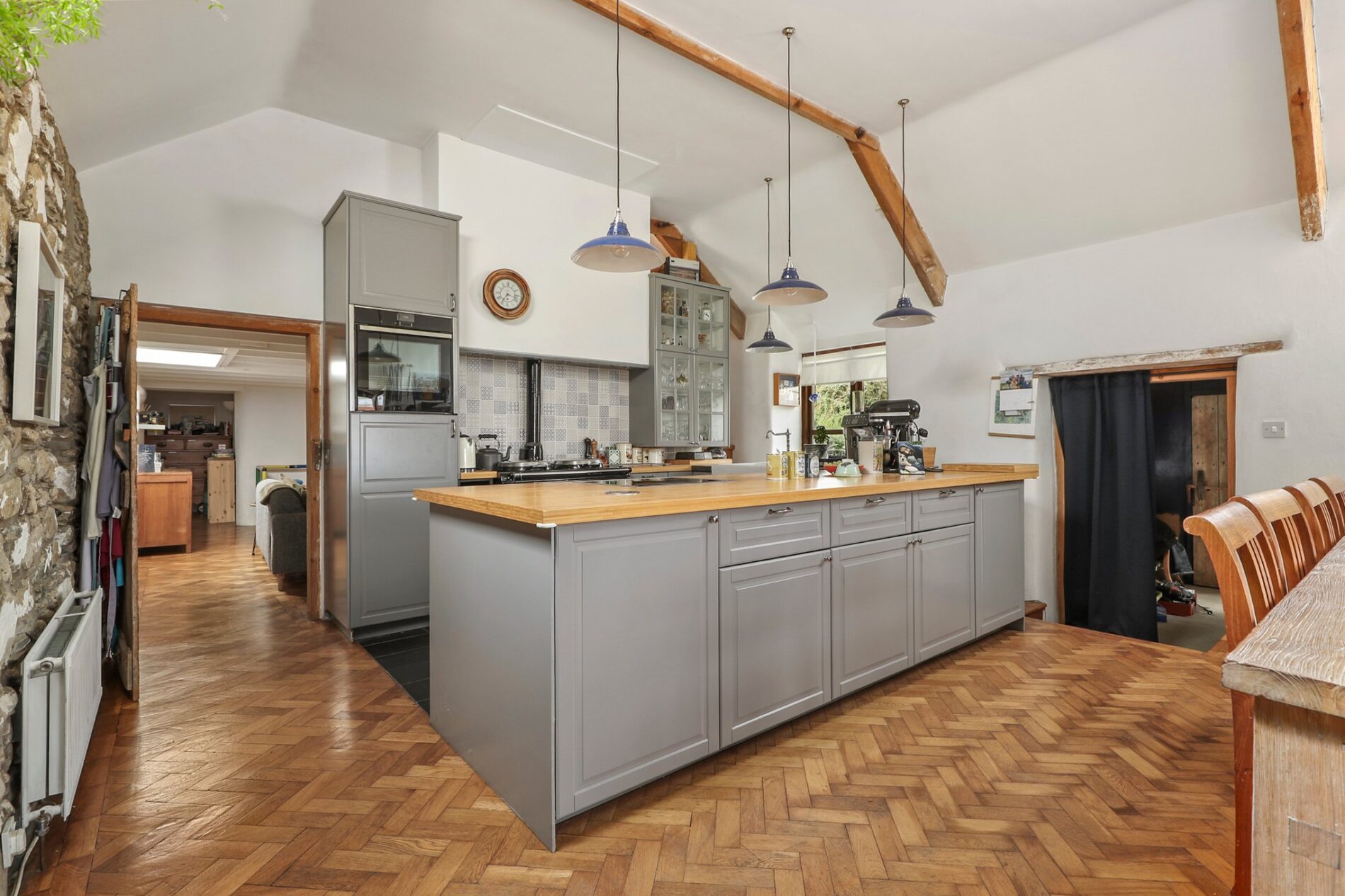 Entering the property from the front, you arrive in the central lounge, with other rooms radiating off it. This inviting space provides ample room for a large seating area, cantered around the wood-burning stove at its heart. The room features exposed ceiling beams and is finished with reclaimed parquet flooring, which continues seamlessly into the kitchen.