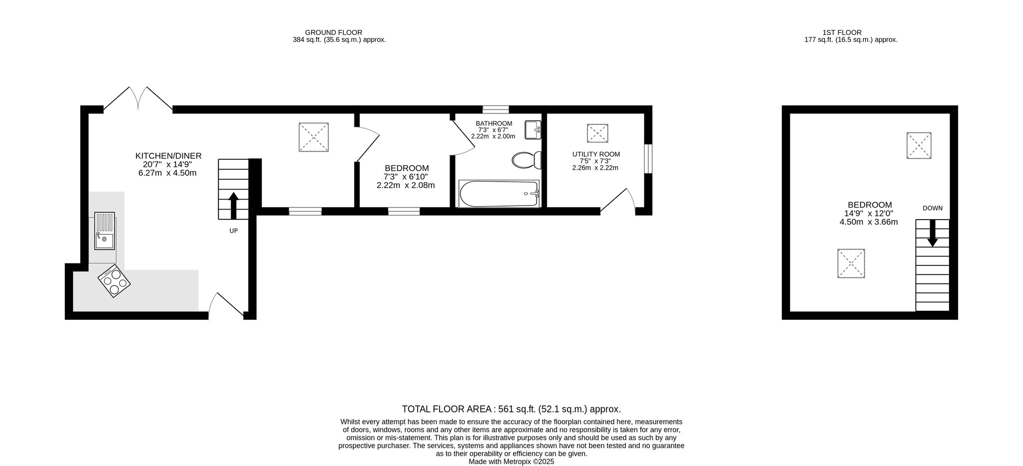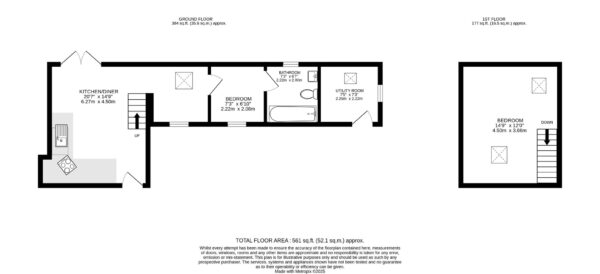 Situated at the far end of the row of barns, The Piggery offers accommodation across two levels for up to four people. The barn is accessed from the front, leading into the main living space, with the kitchen immediately to the left. Continuing through the room, you pass a seating area before reaching the ground-floor bedroom, currently fitted with bunk beds. Beyond this is the bathroom, which features a window overlooking the rear garden. Double doors from the main living area open to a private patio. At the end of the stone barns, an external door gives access to a utility room, with the original piggeries beside it. On the first floor, The Piggery offers a double bedroom with two rooflights in the ceiling above.