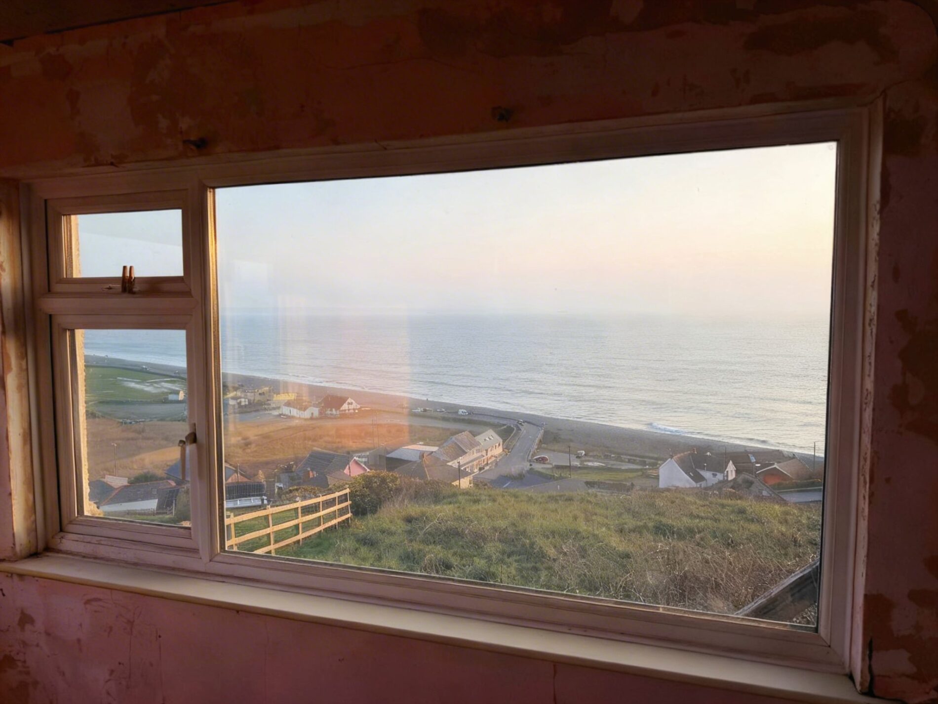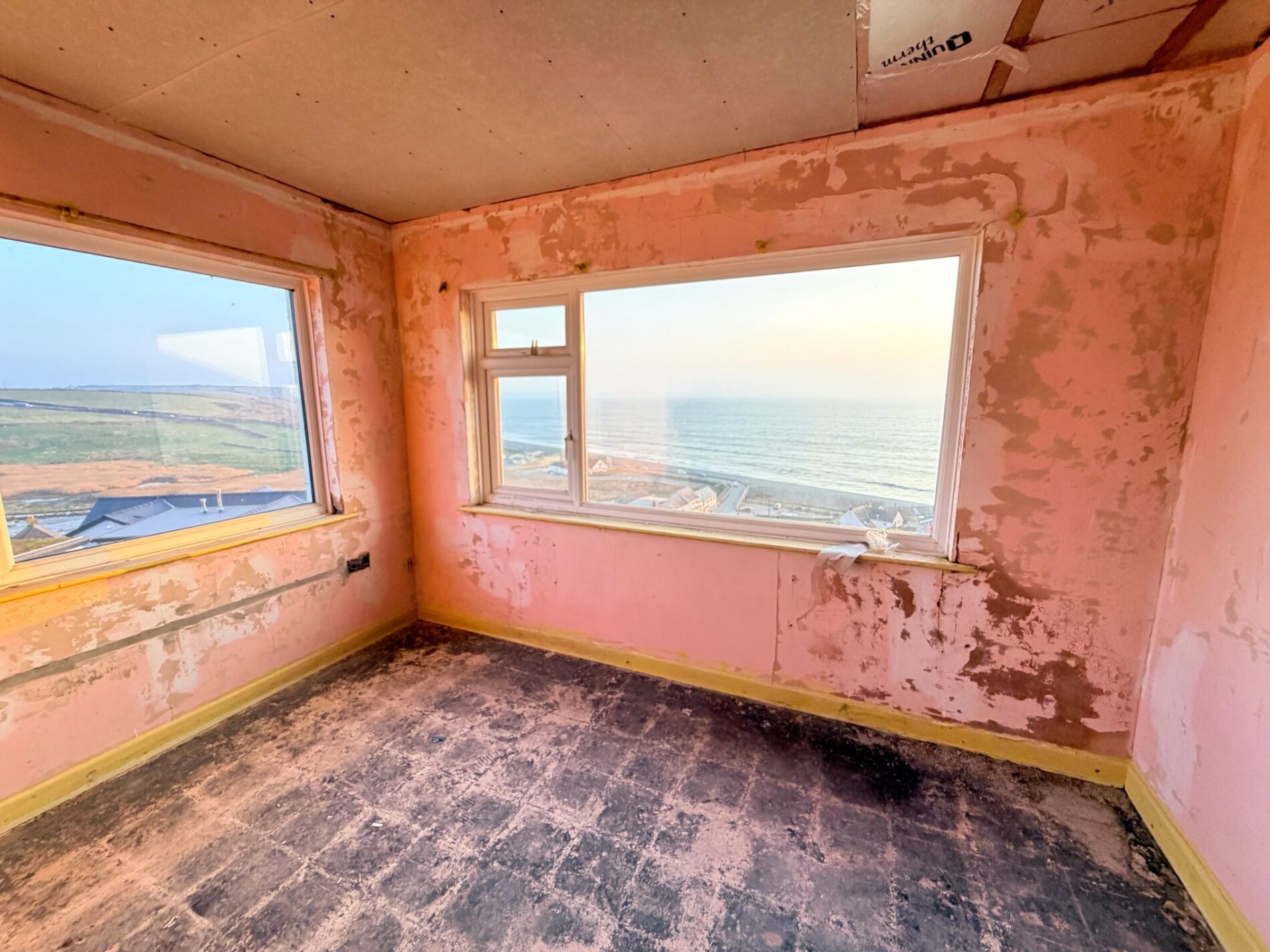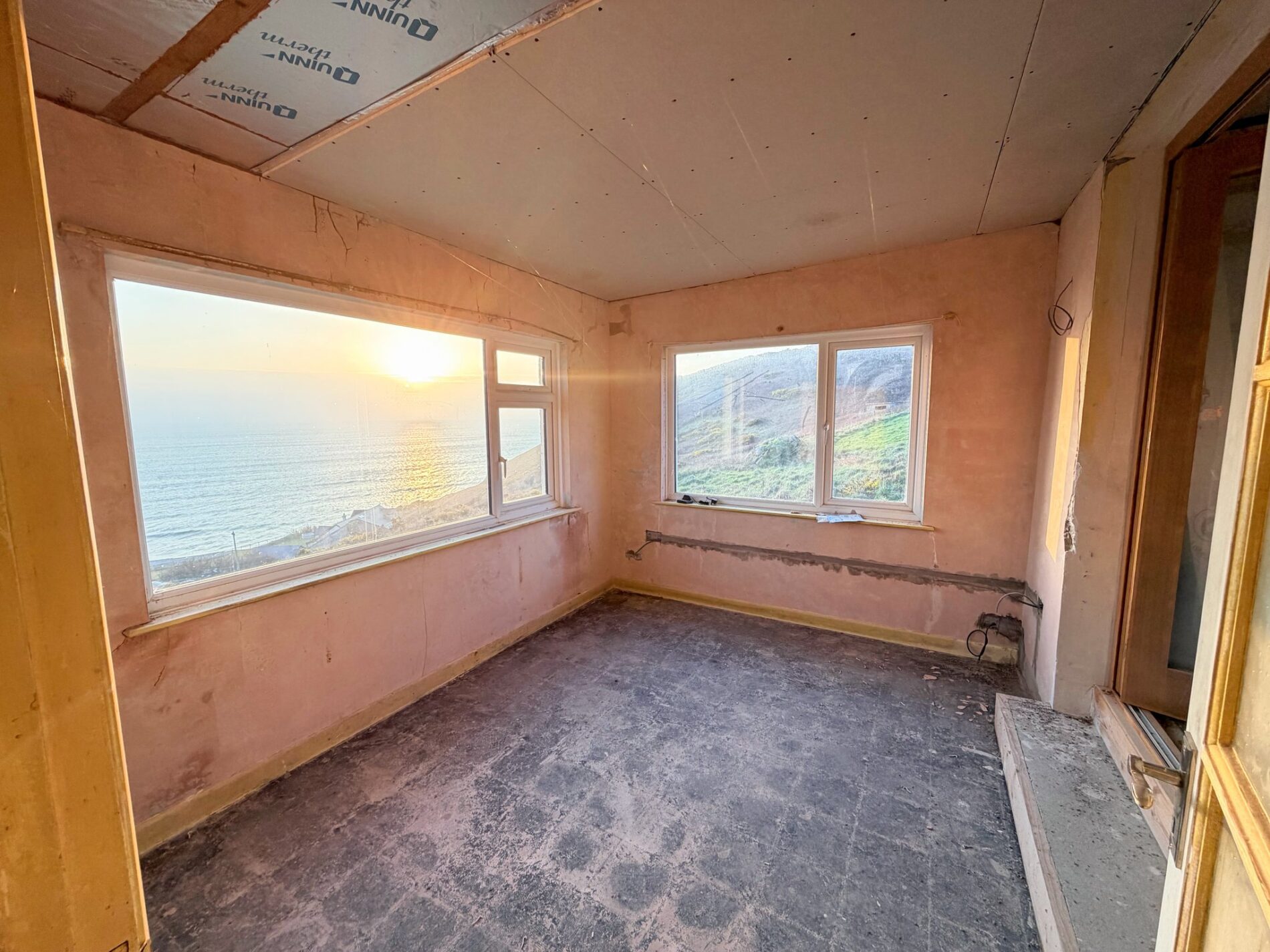 Inside, the building has been pared back to its shell and wired to first fix, presenting a clean slate ready for finishing touches. The current layout is simple: five flexible rooms with provision for a bathroom, plus a rear store that lends itself perfectly to a practical utility area or a dedicated space for beach kit. Outside, the principal garden lies to the property’s flank, opening to uninterrupted sea-and-sky vistas. A solid block outbuilding and a greenhouse sit within this area and could be adapted—think garden studio or laid‑back summer space. Parking is positioned to the side and reached via a private lane.