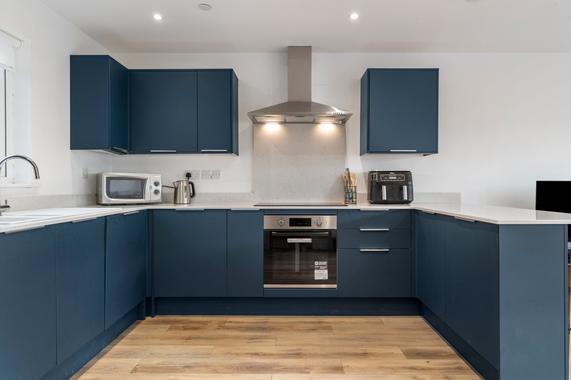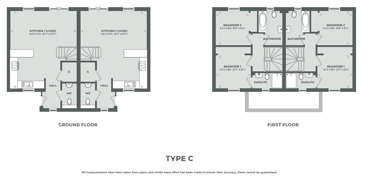 - Modern, practical layout offering an open-plan kitchen/living space with glazed doors to the garden, plus two double bedrooms, each with its own en-suite.
