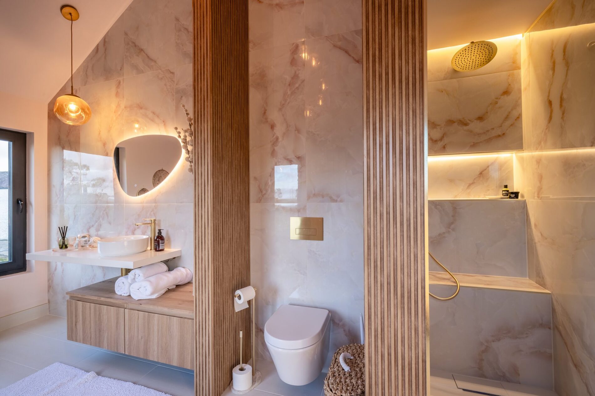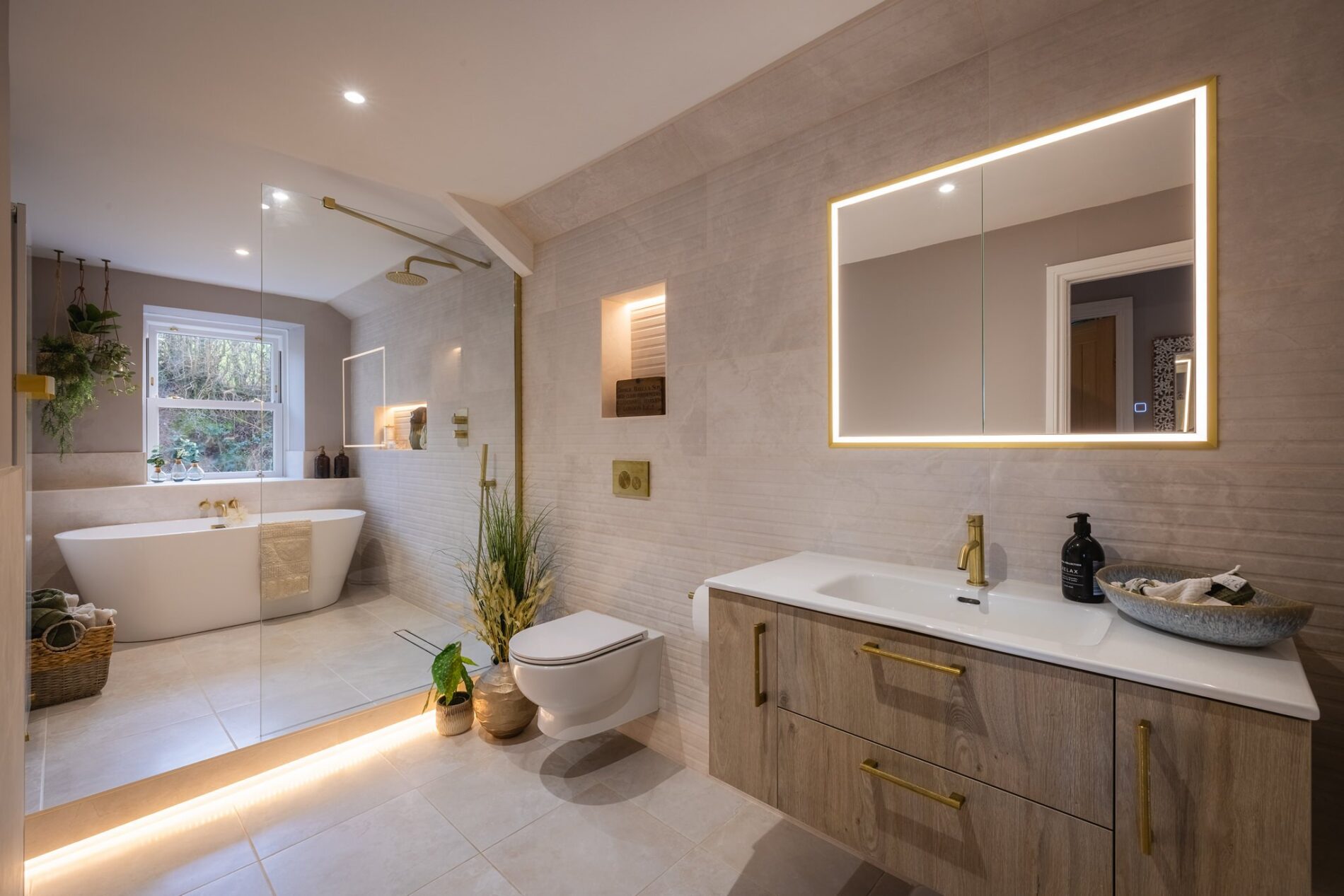 This well-presented bathroom features a wall-mounted lavatory and vanity unit with recessed hidden storage. A step leads up to the walk-in wet-room shower, with a freestanding bathtub positioned at the end of the room. The space is finished with high-quality tiling and recessed LED lighting.
