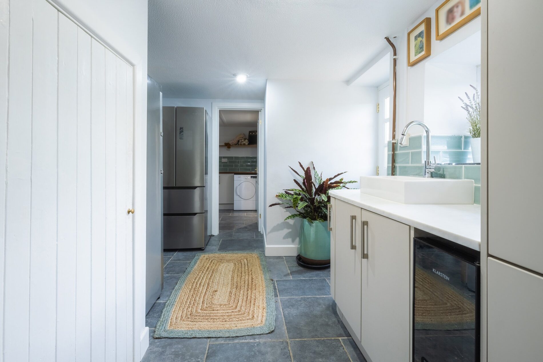 Located at the rear of the home, this highly practical space offers ample built-in storage, a sink, space for additional freestanding white goods, and a built-in pantry cupboard. A stable door opens out to the garden, with another door leading to the ground-floor shower room.