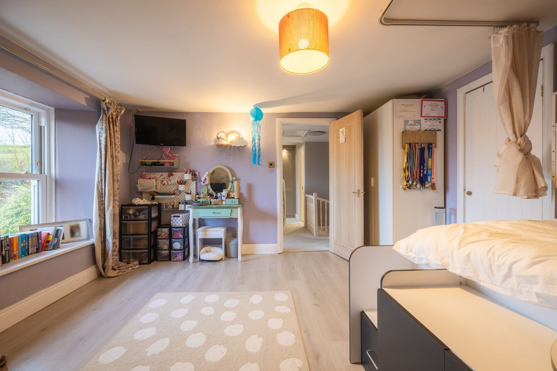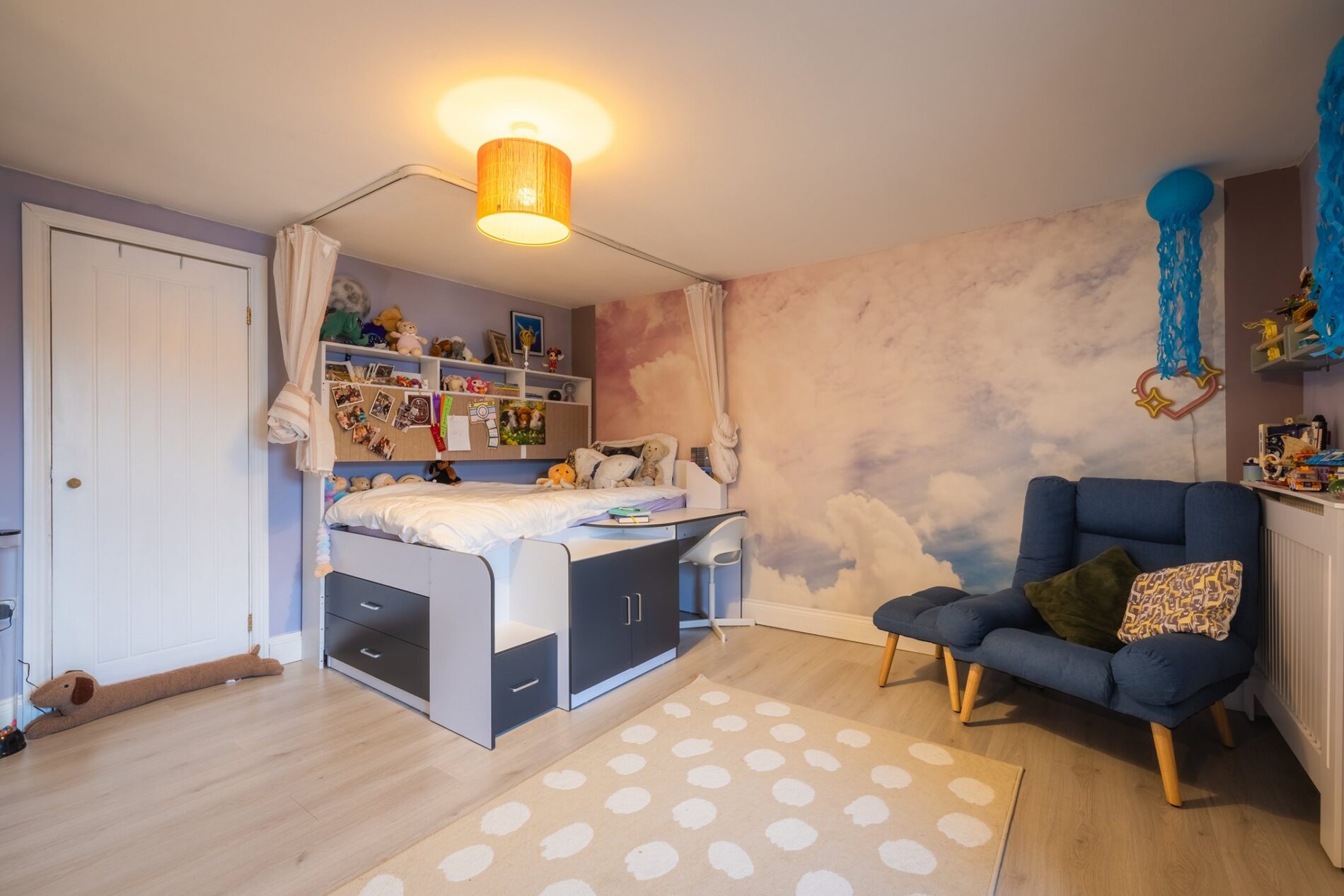 Located to the front of the home above the kitchen, this double bedroom enjoys views over the courtyard and offers ample space for freestanding furniture. A built-in cupboard is accessed via a door on the left-hand wall.