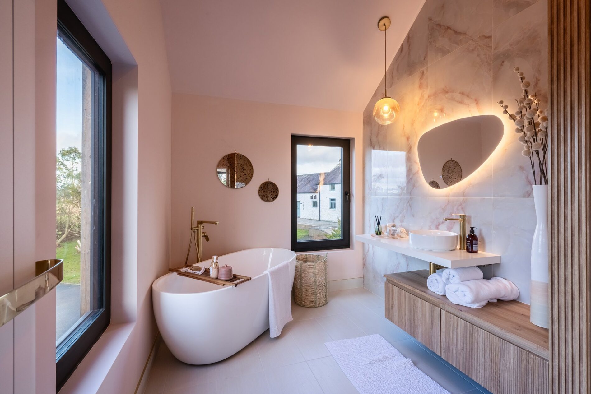 This beautiful ensuite provides a perfect sanctuary. A freestanding bath is positioned against the far wall, with a floating hand basin alongside. There is a wall-mounted lavatory and a stepless walk-in shower. The bathroom is double-height, open to the vaulted ceiling above, adding further drama to the space. Finished with high-quality tiling and wood panelling, it also benefits from electric underfloor heating.