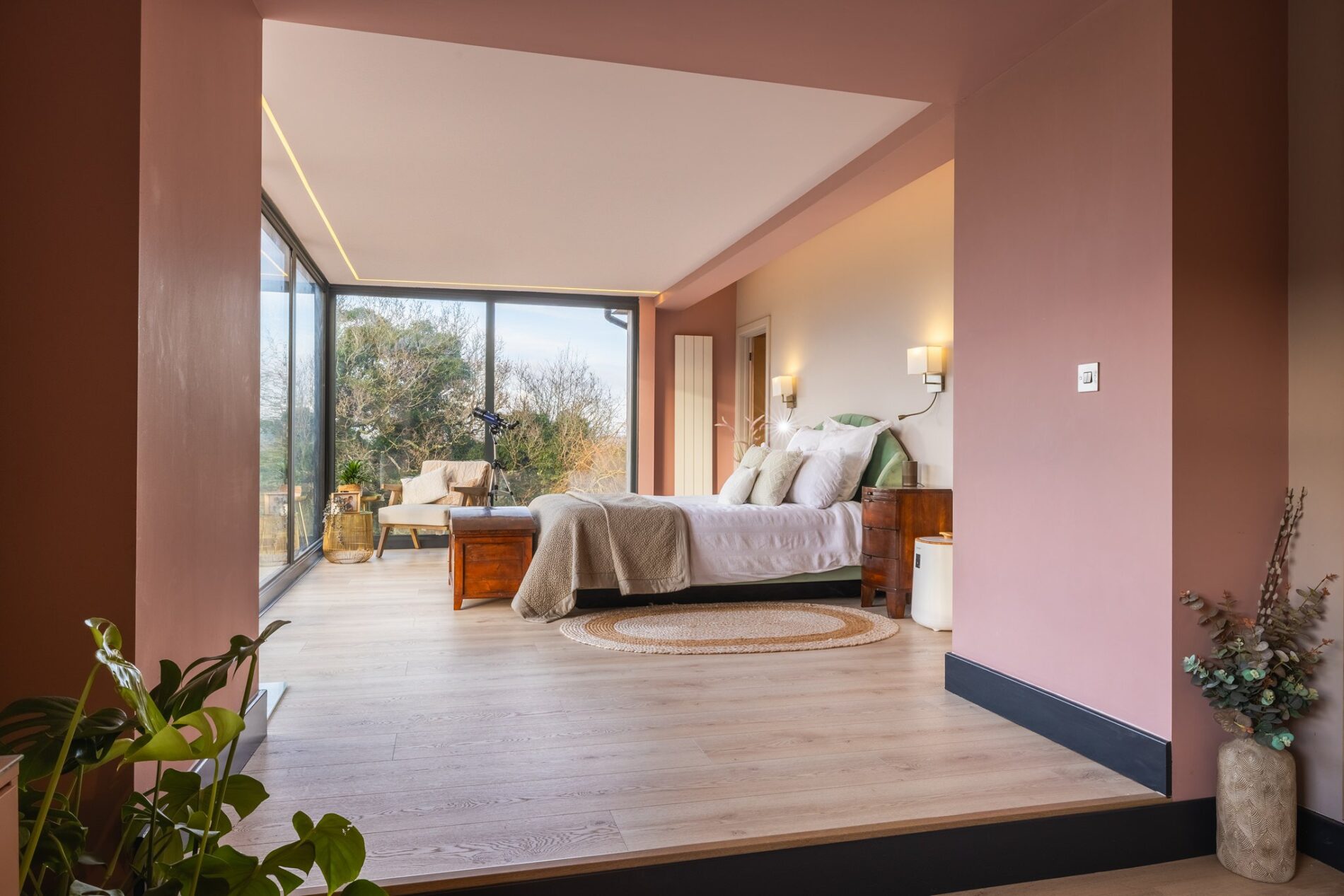 The stunning extension incorporates this exceptional principal bedroom suite, one of the most impressive bedrooms we have had the pleasure of marketing. Entry is via a spacious dressing room area with a full range of fitted storage and a desk, with a window to the rear leading into the main bedroom beyond. The rear wall of the bedroom is fully glazed, offering breath-taking countryside views. Recessed LED lighting throughout creates a calm and restful atmosphere. A door to the right of the bed leads back into the dressing room, while a door to the left opens into the ensuite.