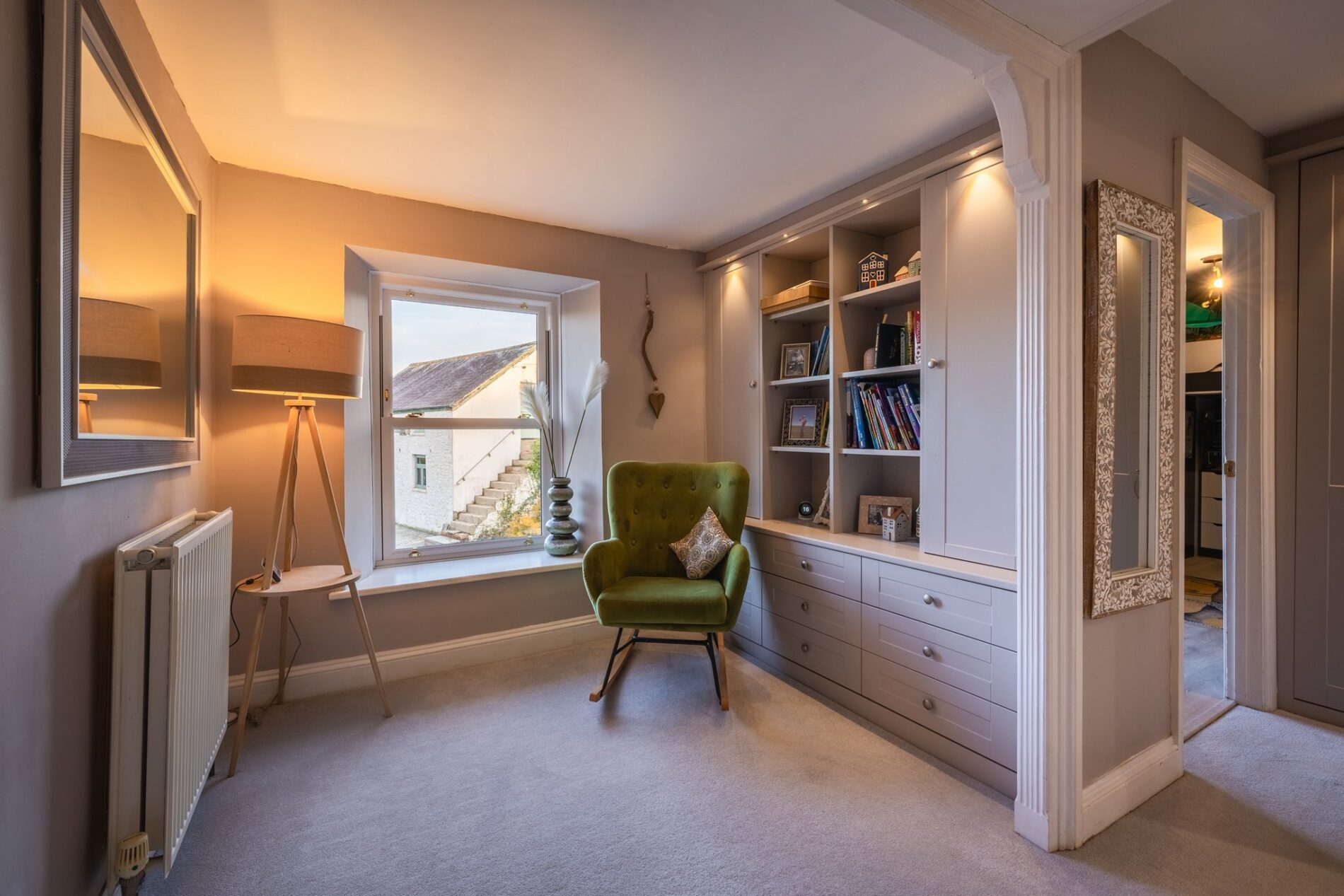 Equally impressive, the dressing room makes excellent use of space, with fitted storage extending into the vaulted ceiling. It offers superb wardrobes and shelving, along with a window to the front and feature lighting throughout.