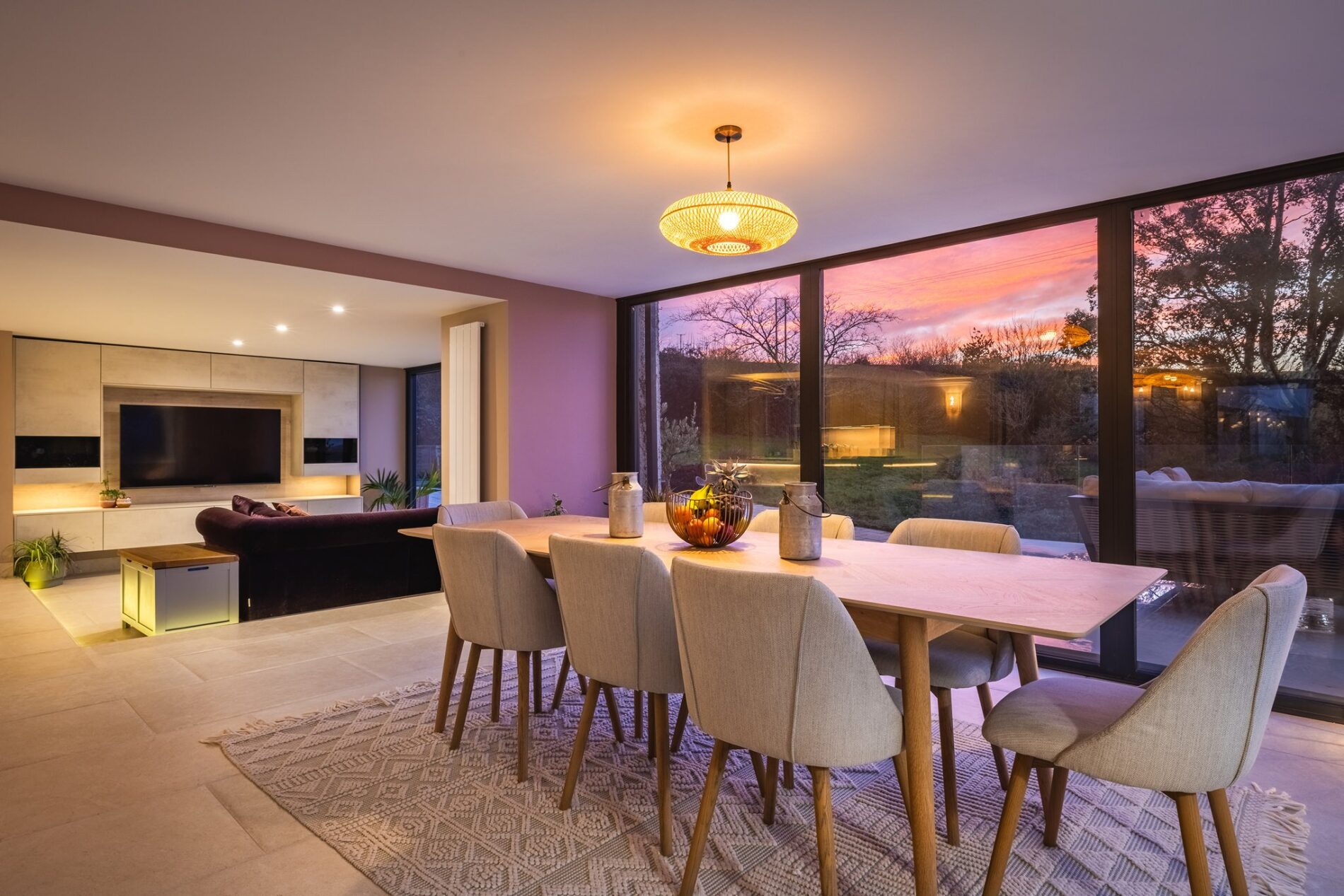 The undeniable centrepiece of the home is the stunning open-plan living space. The original kitchen was significantly extended to include two seating areas and a dining space. Full-length glazed panels, sliding doors, and bi-fold doors open onto the garden and raised deck at the rear of the home, perfectly framing views of the open countryside. Additional windows to the side and front ensure natural light throughout the day. The floor is tiled and incorporates a mixture of wet and electric underfloor heating, with a wood-burning stove providing additional warmth on cooler days. The room also benefits from recessed LED lighting in the ceiling and along the edge of the sunken seating area, as well as a built-in media wall with space for a wall-mounted television.