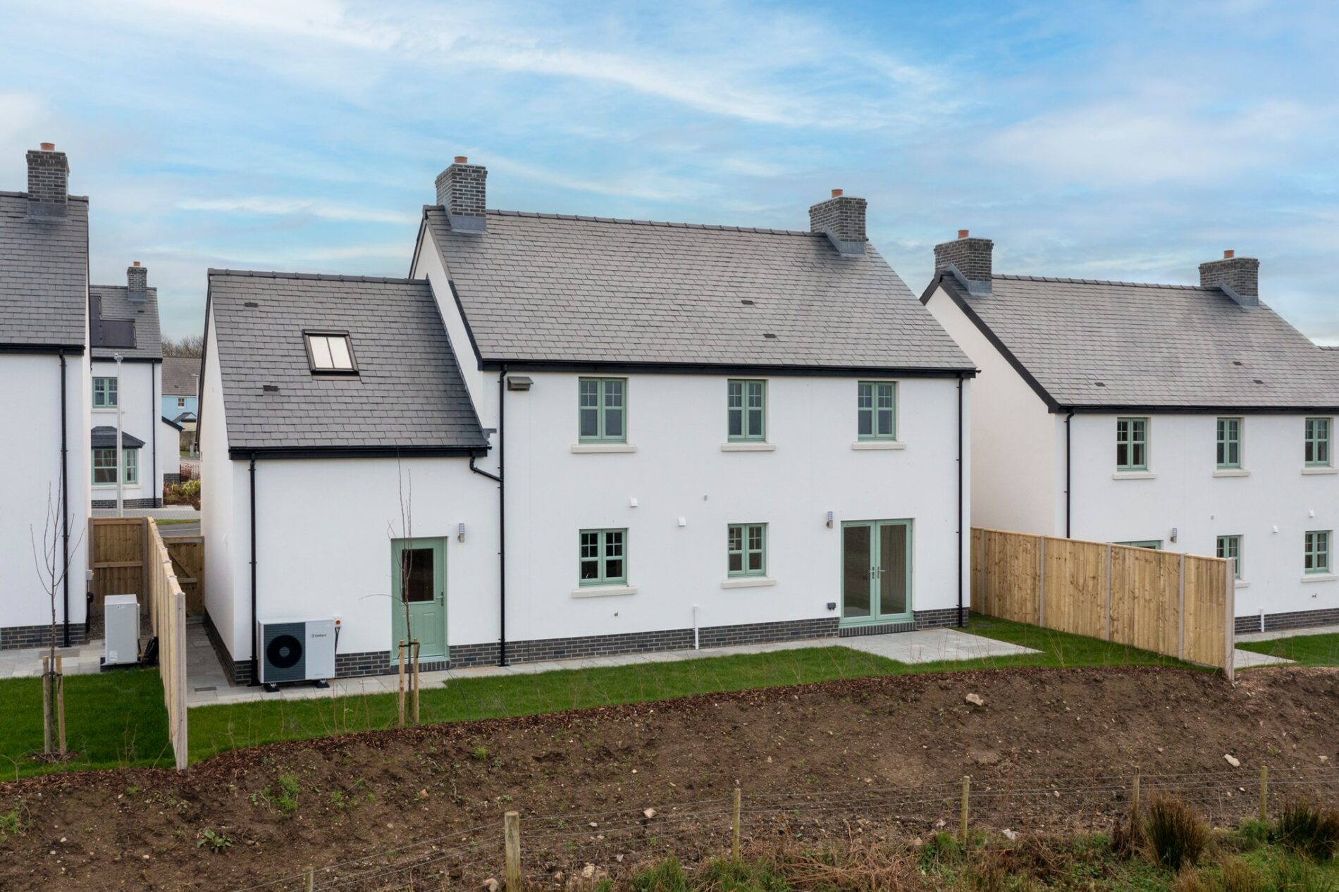 - Houses: Air source heat pump system connected to solar panels to achieve an EPC A rating