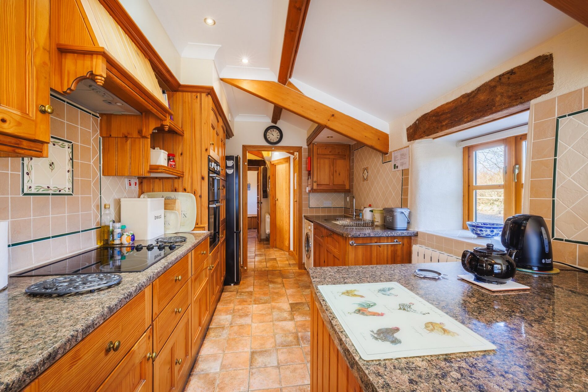 Granary Cottage complements the main residence beautifully, offering a characterful one-bedroom annexe. To the front, a former grain store has been thoughtfully converted into a useful laundry/utility room. Inside, the cottage provides an inviting open-plan living space with a stone and brick fireplace and woodburning stove, creating a cosy and welcoming atmosphere. A well-appointed kitchen and modern bathroom are positioned off the main living area. Stairs rise to the first floor, where a spacious double bedroom is found, currently arranged to accommodate both a double and single bed, making it ideal for guests.