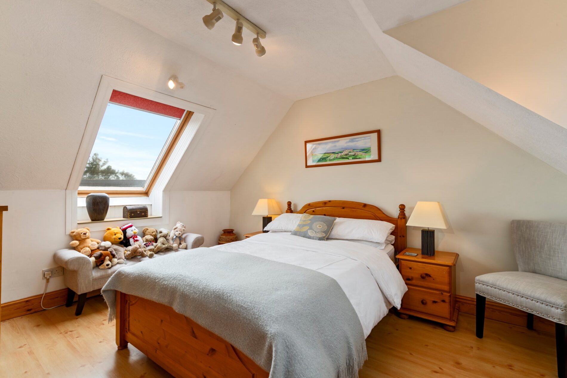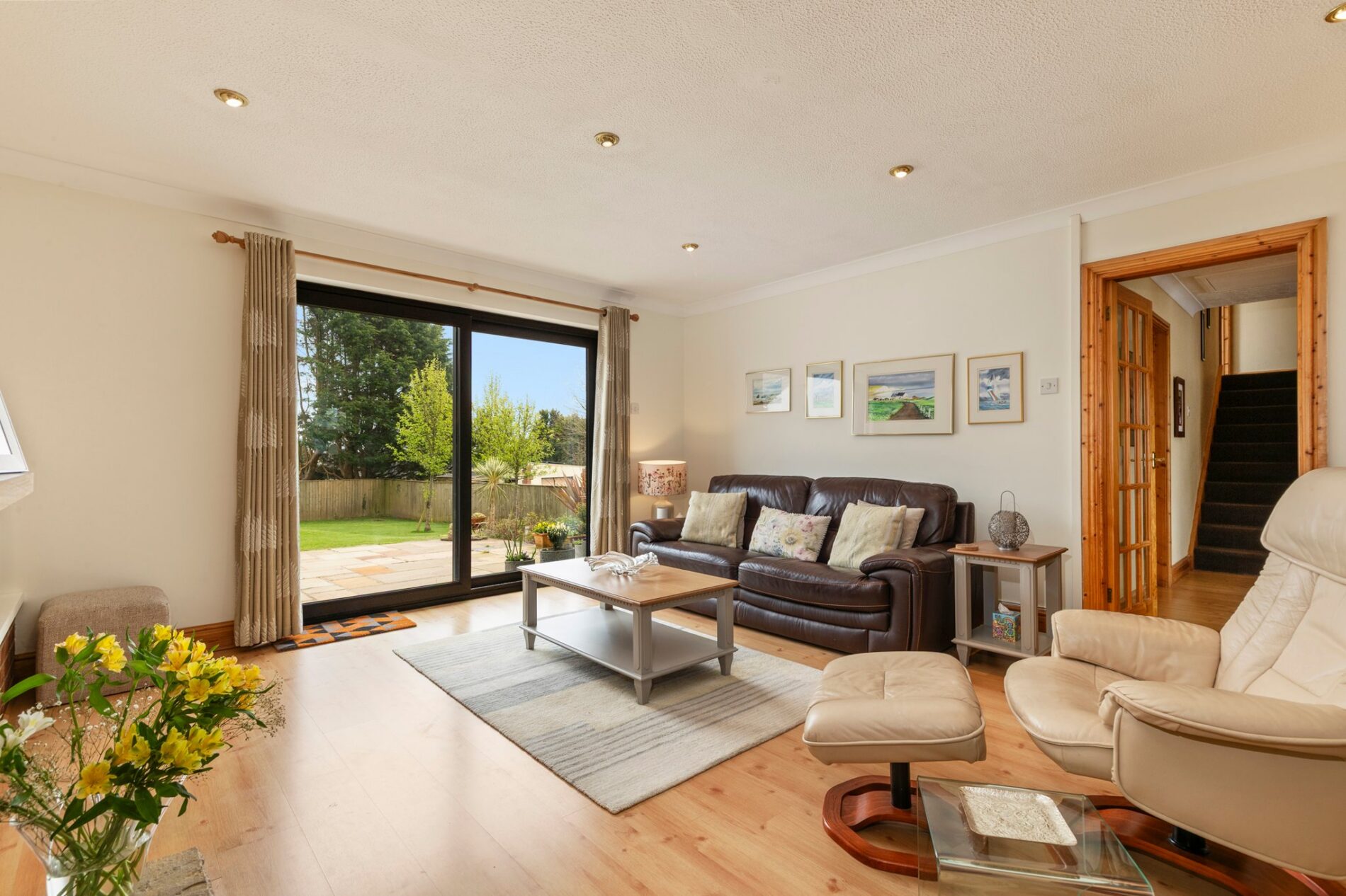 A short set of steps leads to a split-level area comprising two spacious double bedrooms and a cosy single bedroom, currently used as a tranquil study. A contemporary family bathroom serves this level, featuring modern fittings and a calming, elegant design.