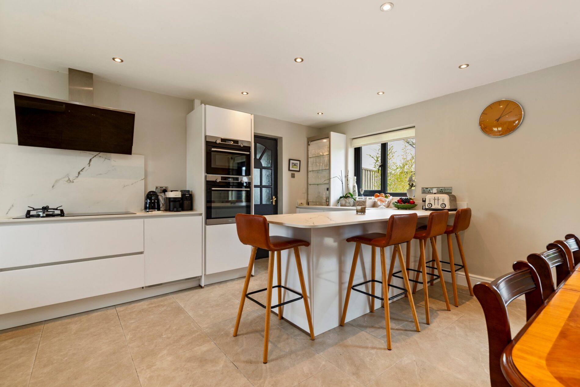 Adjacent to the TV room is a generous dining room, which flows naturally into a well-equipped kitchen. The kitchen offers ample wall and base units, providing excellent storage and functionality, and is complemented by a separate utility room for added convenience.