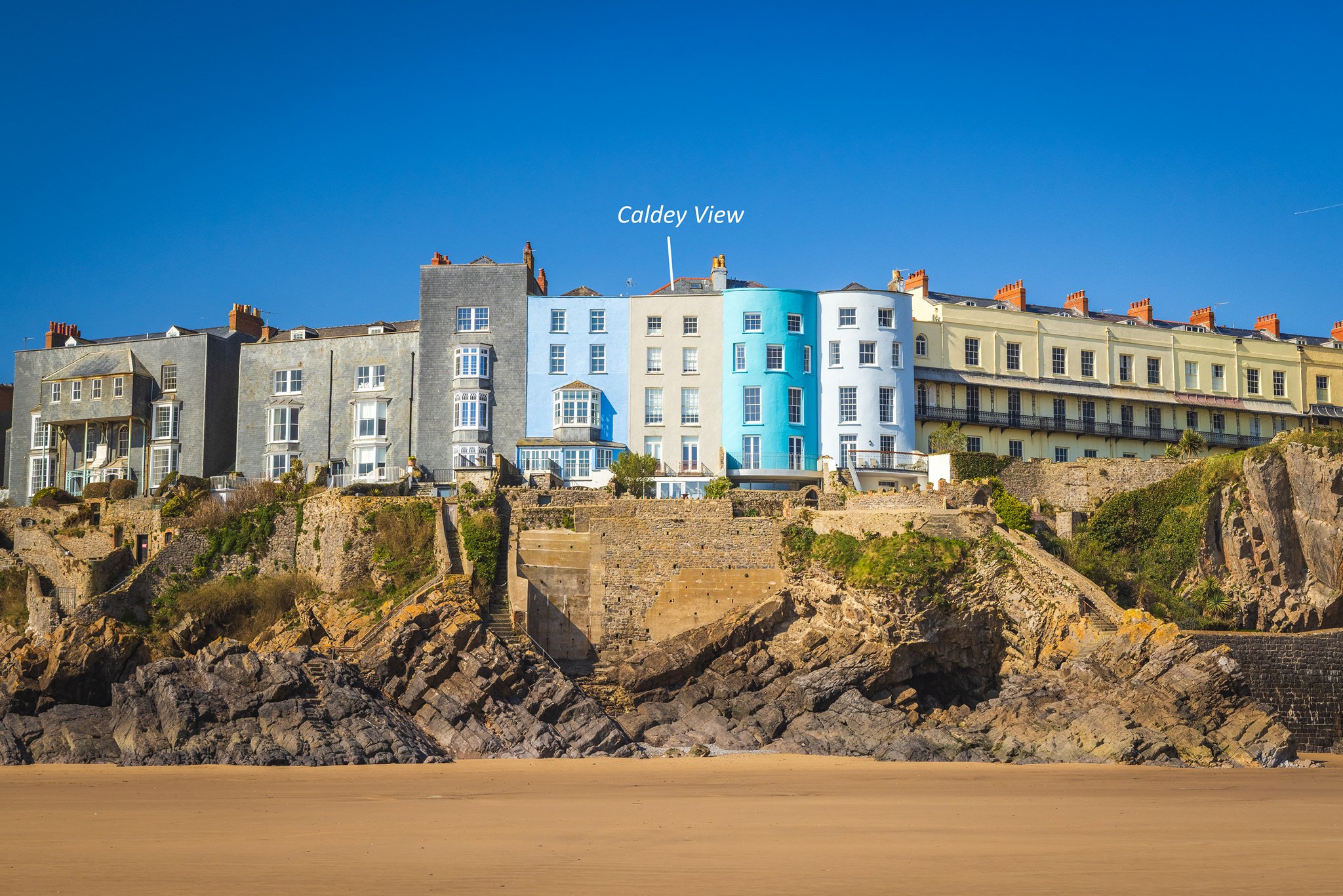Approaching from the north, take the A478 from Kilgetty following signs for Tenby. When you enter the town proceed on the A478 passing Tenby Cottage Hospital on your left. When you reach the seafront and High Street continue into the centre of the town, passing St Mary’s Church on your right, and proceed through Tudor Square. When you reach the bottom of the square follow St Julian’s Street and as the road turns and heads downhill towards the harbour you will find Caldey View on your right hand side.