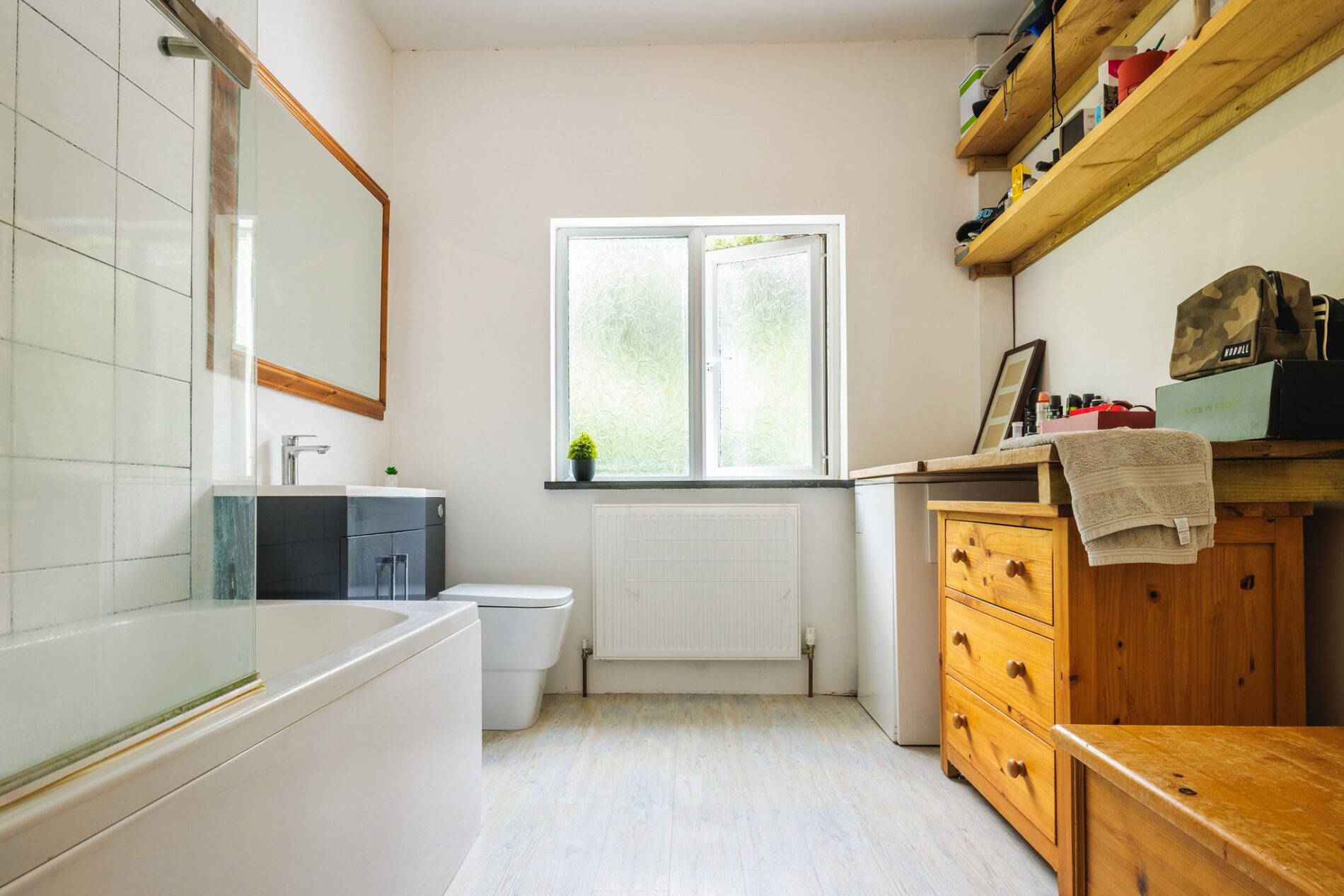 This bathroom offers a bath with shower over, lavatory and hand basin with plenty of space for storage along with an obscured glass window to the rear.