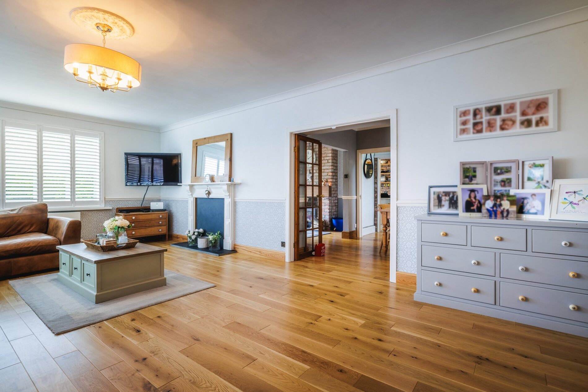 Entering the property in the central reception room you pass through a set of glazed double doors and arrive in a pleasant seating area with a wood burning stove as a focal point. Passing through an archway to the rear of the first area you come to a good sized dining space. The dining space has a set of glazed double doors to the rear, which open out to the sunroom at the front of the annex. A doorway to the left leads into a small hallway and then the kitchen, with a door to the right leading you into the large living room. Both this room and the living room next door are finished with an engineered oak floor.